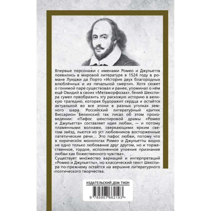 Ромео и Джульетта. Уильям Шекспир. Эта книга - эксклюзивная классика мировой литературы. Впервые персонажи с именами Ромео и Джульетта появились в мировой литературе в 1524 году в романе Луиджи да Порто "История двух благородных влюблённых и их печальной смерти". Хотя сюжет о гонимой паре существовал и ранее, упоминал о нём ещё Овидий в своих "Метаморфозах". Гений Шекспира сумел преобразить эту расхожую историю в великую трагедию, которая будоражит сердца и остаётся актуальной во все эпохи в разных уголках земного шара.Российский литературный критик Виссарион Белинский так писал об этом произведении: "Пафос шекспировой драмы "Ромео и Джульетта" составляет идея любви, и потому пламенными волнами, сверкающими ярким светом звёзд, льются из уст любовников восторженные патетические речи Это пафос любви, потому что в лирических монологах Ромео и Джульетты видно не одно только любование друг другом, но и торжественное, гордое, исполненное упоения признание любви как божественного чувства".Любые исторические романы - словно поэзия. Существует множество вариаций и интерпретаций "Ромео и Джульетты", но классический текст Шекспира по-прежнему остаётся на вершине литературного поэтического творчества.