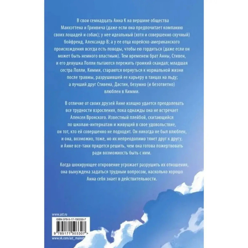 ISBN 9785-17150-3307. Анна К. В свои семнадцать Анна К на вершине общества Манхэттена и Гринвича (даже если она предпочитает компанию своих лошадей и собак); у нее идеальный (хотя и совершенно скучный) бойфренд, Александр В; а у ее отца, корейско-американского происхождения, всегда есть поводы, чтобы ею гордится (даже если он может быть немного властным). Тем временем брат Анны, Стивен, и его девушка Лолли пытаются пережить громкий скандал; младшая сестра Лолли, Кимми, пытается вернуться к нормальной жизни после травмы, разрушившей ее карьеру в танцах на льду; а лучший друг Стивена, Дастин, безумно (и безответно) влюблен в Кимми. В отличие от своих друзей Анне изящно удается преодолевать все трудности взросления, пока однажды она не встречает Алексея Вронского. Известный плейбой, скитающийся по школам-интернатам и живущий в свое удовольствие, он тот, кто ей совершенно не подходит. Он никогда не был влюблен, и она, возможно, тоже, но их непреодолимо притягивает друг к другу, и Анне все-таки придется решить, чем она готова пожертвовать за возможность быть с ним. Когда шокирующее откровение угрожает разрушить их отношения, она вынуждена задаться трудным вопросом, насколько хорошо она себя знает в действительности.