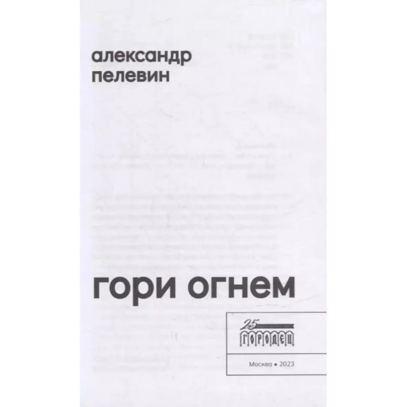 Гори огнем. Пелевин. А. В популярной психологии бытует мнение, что, представ перед выбором из двух зол, человек всегда решает пойти по тому пути, который требует наименьших усилий. Так ли это?Что руководит человеком, который выбирает стать предателем? Как жить, сделав неверный выбор?Повесть о настоящем человеке наоборот, как описывает ее автор, прольет свет в потемках души оступившегося человека.