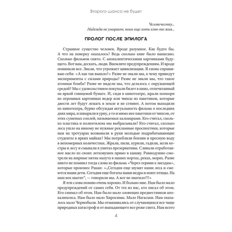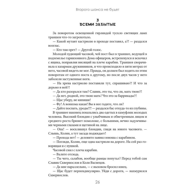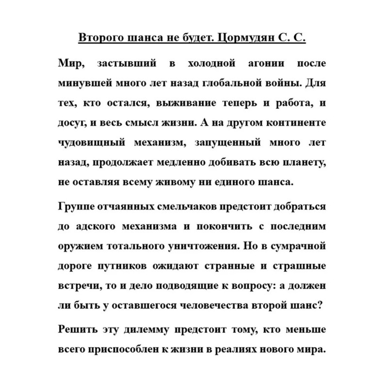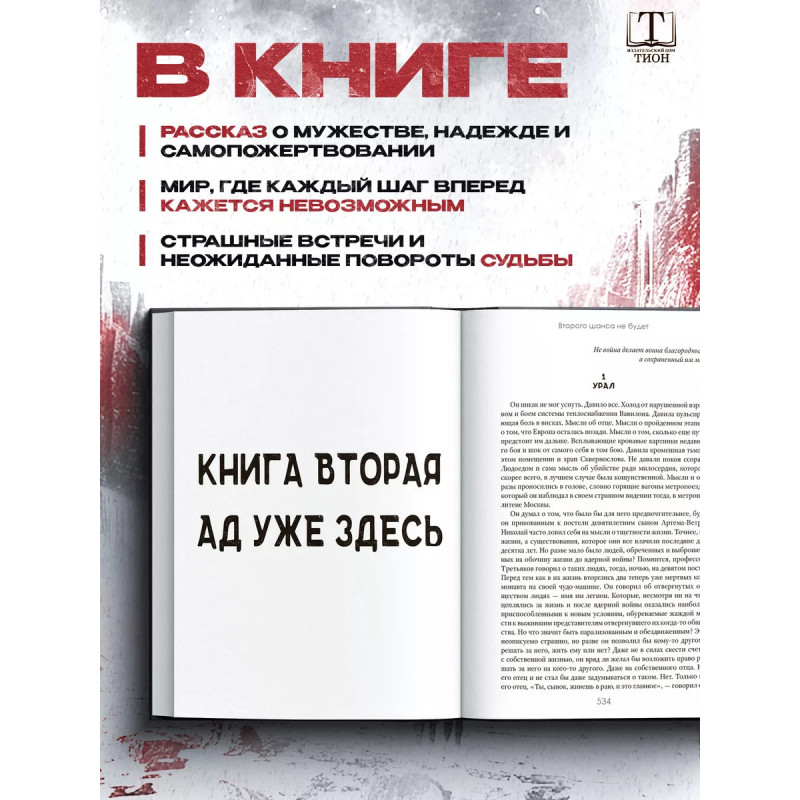 Второго шанса не будет. Цормудян С.С. Мир, застывший в холодной агонии после минувшей много лет назад глобальной войны. Для тех, кто остался, выживание теперь и работа, и досуг, и весь смысл жизни. А на другом континенте чудовищный механизм, запущенный много лет назад, продолжает медленно добивать всю планету, не оставляя всему живому ни единого шанса.Группе отчаянных смельчаков предстоит добраться до адского механизма и покончить с последним оружием тотального уничтожения. Но в сумрачной дороге путников ожидают странные и страшные встречи, то и дело подводящие к вопросу: а должен ли быть у оставшегося человечества второй шанс?Решить эту дилемму предстоит тому, кто меньше всего приспособлен к жизни в реалиях нового мира.От одного из авторов Метро 2033