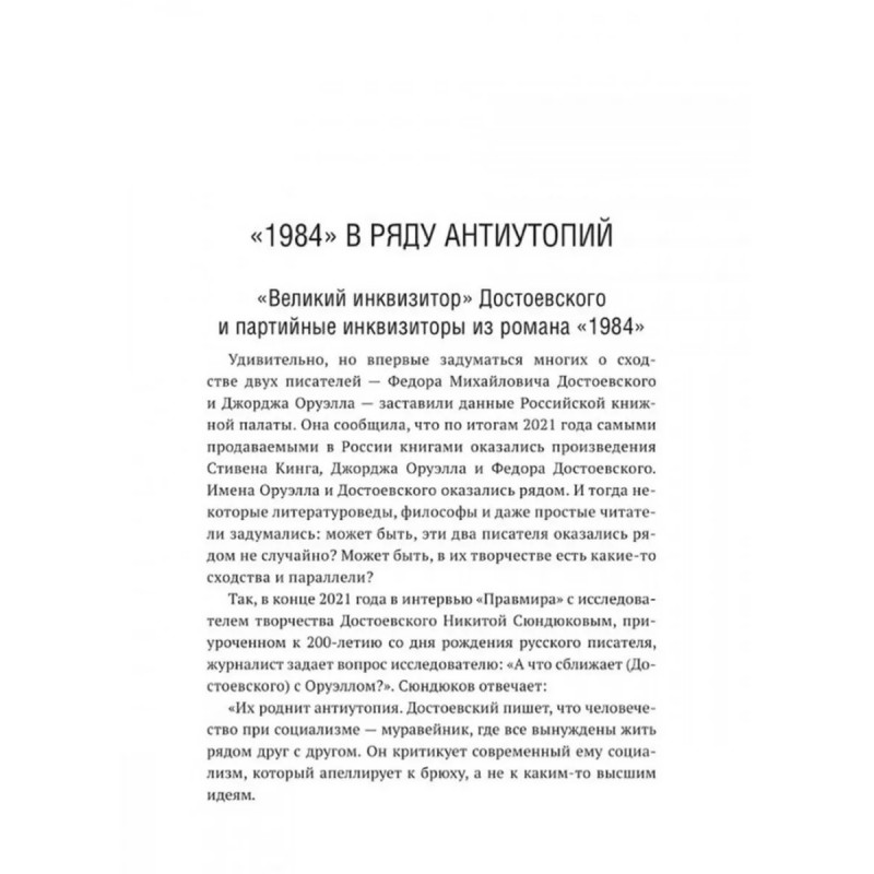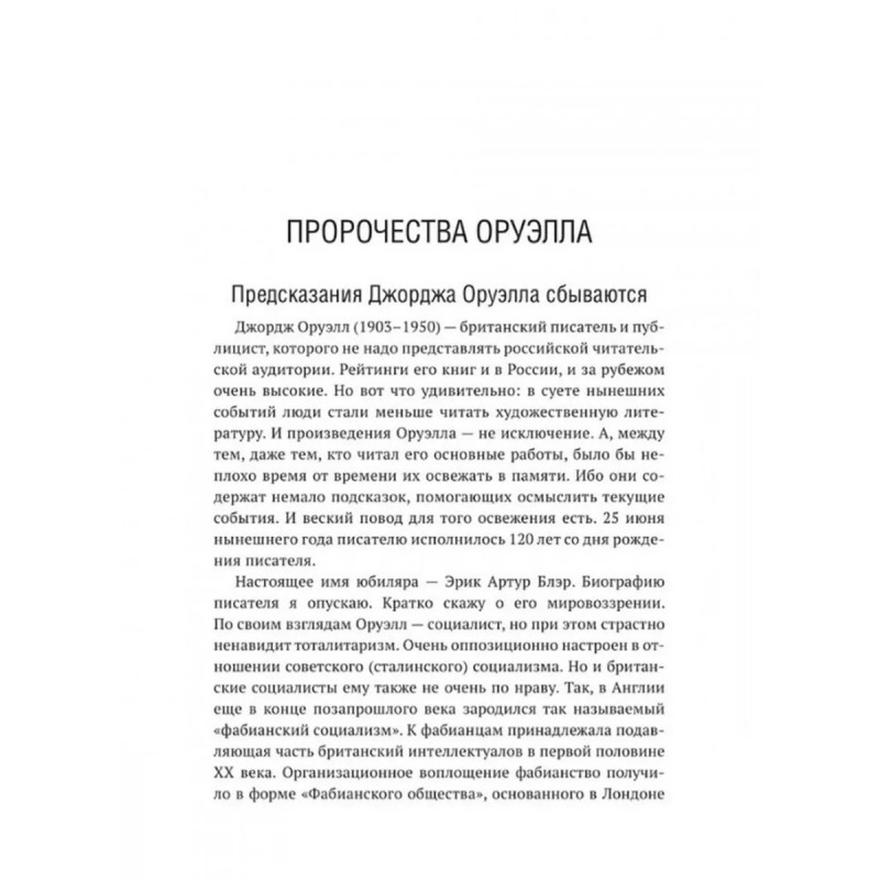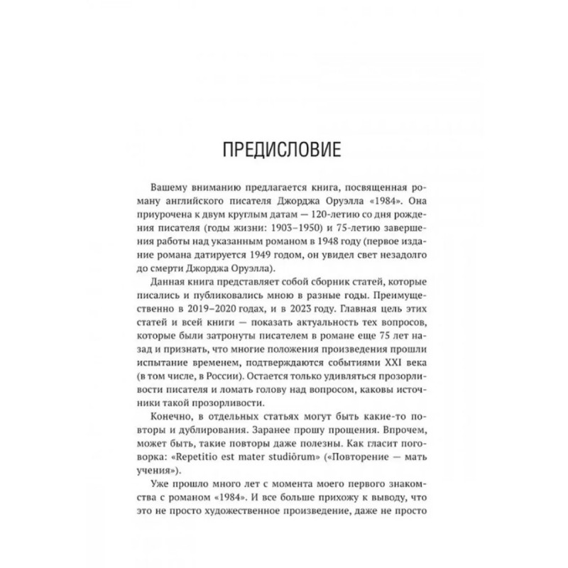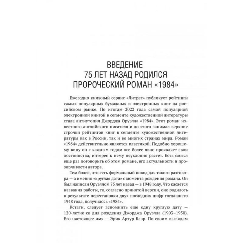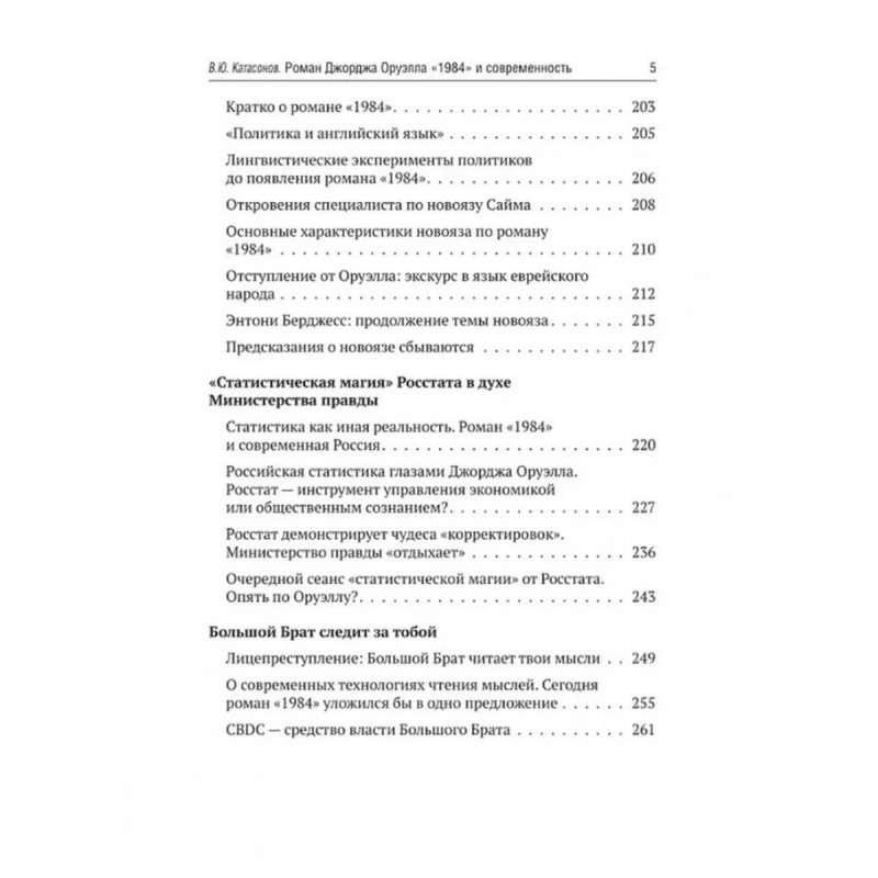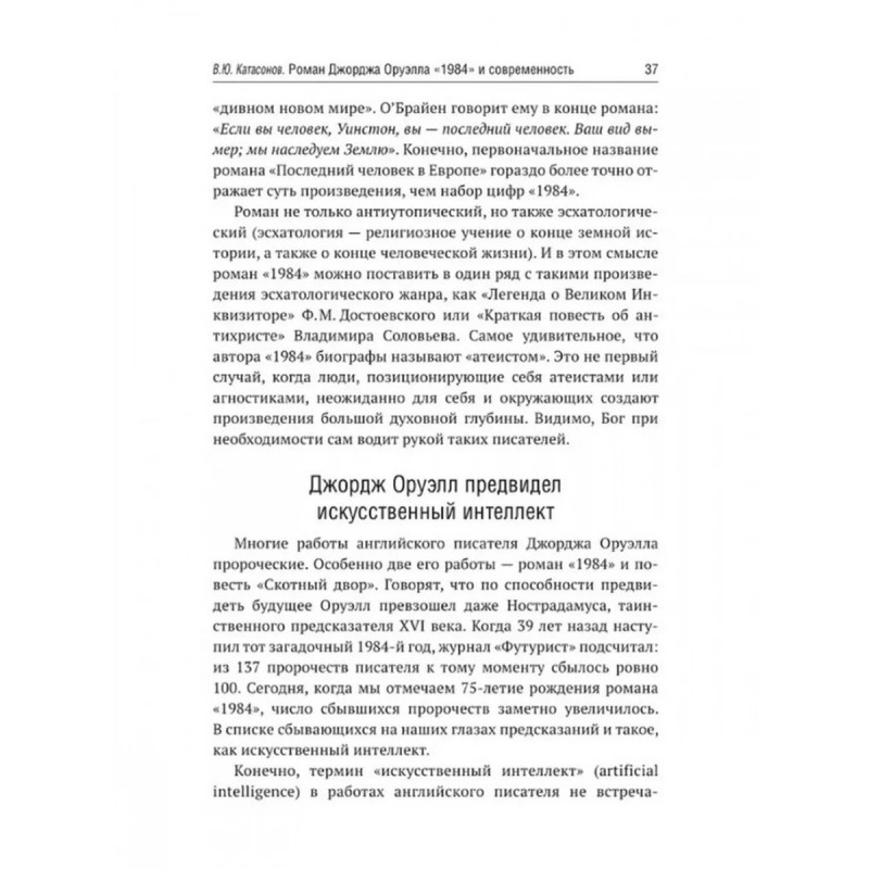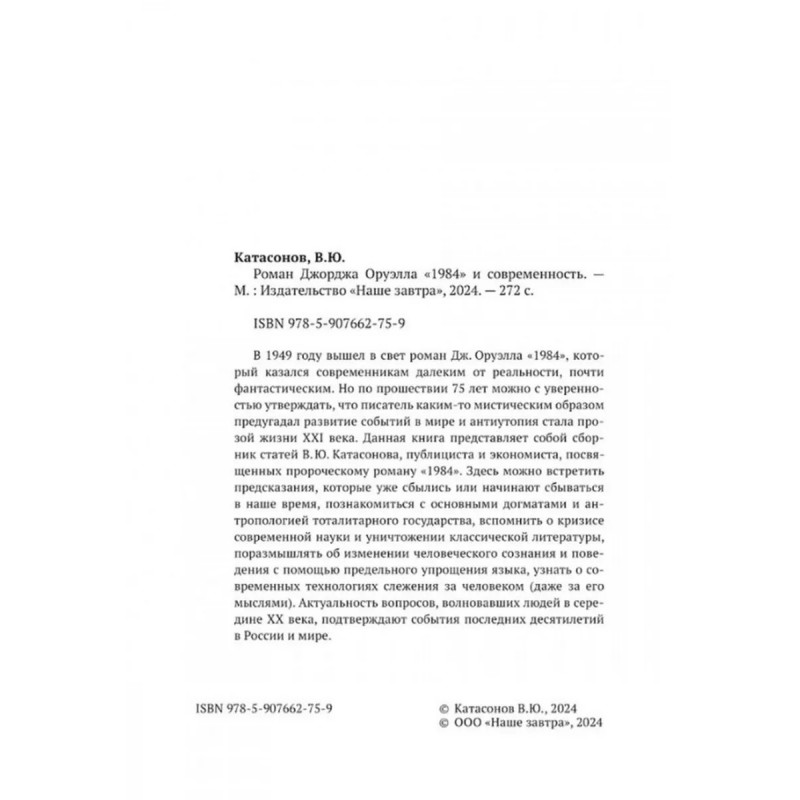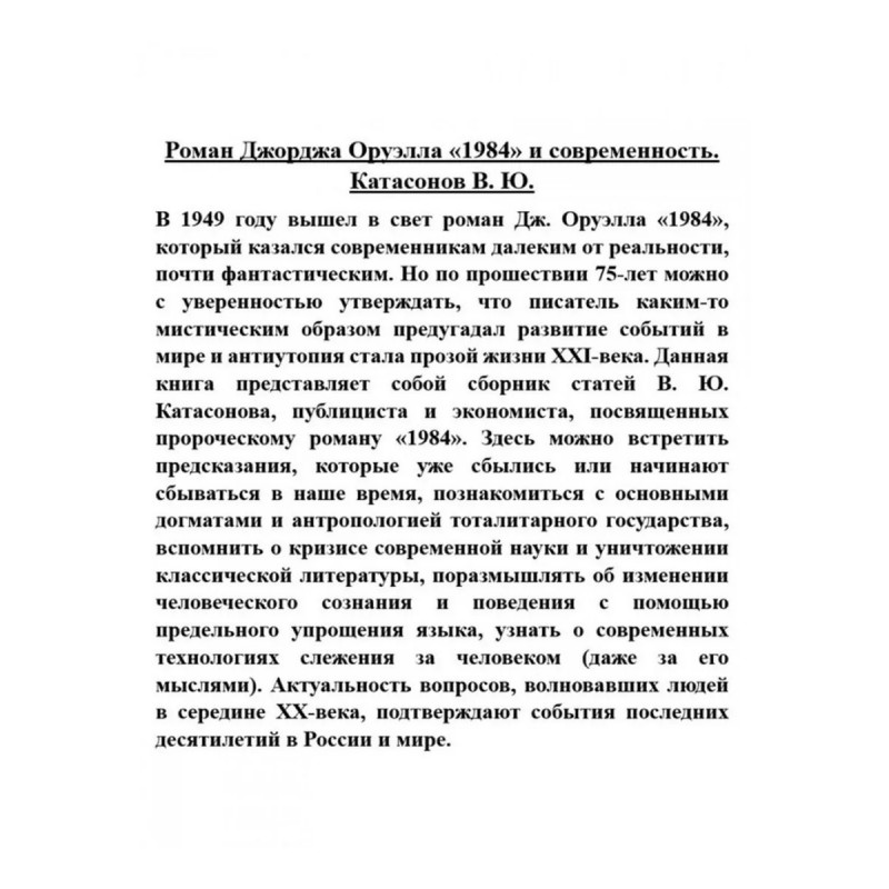 Роман Джорджа Оруэлла "1984" и современность. Катасонов В.Ю. В 1949 году вышел в свет роман Дж. Оруэлла "1984", который казался современникам далеким от реальности, почти фантастическим. Но по прошествии 75-лет можно с уверенностью утверждать, что писатель каким-то мистическим образом предугадал развитие событий в мире и антиутопия стала прозой жизни XXI-века. Данная книга представляет собой сборник статей В. Ю. Катасонова, публициста и экономиста, посвященных пророческому роману "1984". Здесь можно встретить предсказания, которые уже сбылись или начинают сбываться в наше время, познакомиться с основными догматами и антропологией тоталитарного государства, вспомнить о кризисе современной науки и уничтожении классической литературы, поразмышлять об изменении человеческого сознания и поведения с помощью предельного упрощения языка, узнать о современных технологиях слежения за человеком (даже за его мыслями). Актуальность вопросов, волновавших людей в середине XX-века, подтверждают события последних десятилетий в России и мире.