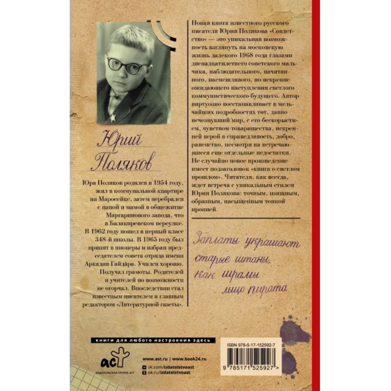 Совдетство. Пересменок. Поляков Ю. М. Новая книга известного русского писателя Юрия Полякова "Совдетство" - это уникальная возможность взглянуть на московскую жизнь далекого 1968 года глазами двенадцатилетнего советского мальчика, наблюдательного, начитанного, насмешливого, но искренне ожидающего наступления светлого коммунистического будущего. Автор виртуозно восстанавливает в мельчайших подробностях тот, давно исчезнувший мир, с его бескорыстием, чувством товарищества, искренней верой в справедливость, добро, равенство, несмотря на встречающиеся еще отдельные недостатки. Не случайно новое произведение имеет подзаголовок "книга о светлом прошлом". Читателя, как всегда, ждет встреча с уникальным стилем Юрия Полякова: точным, изящным, образным, насыщенным тонкой иронией.