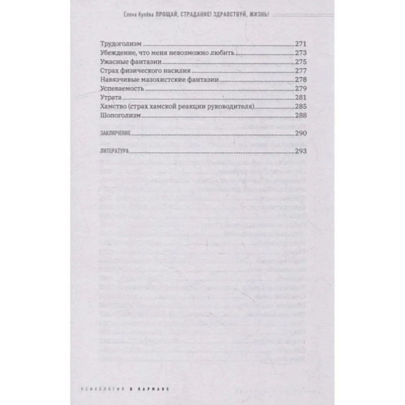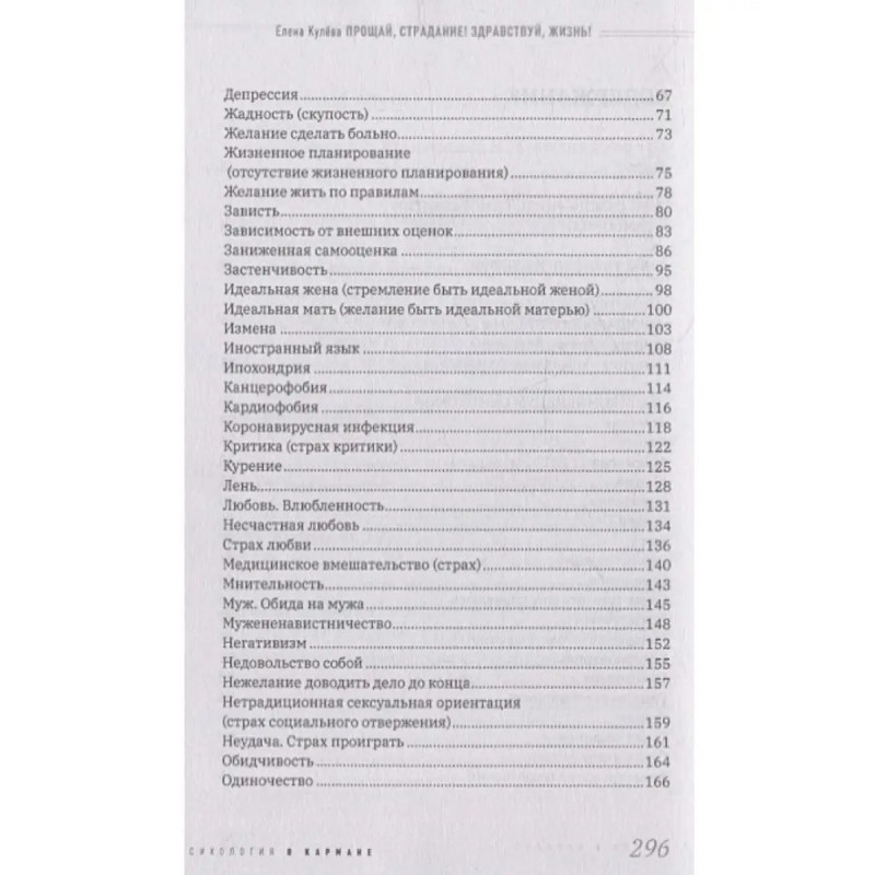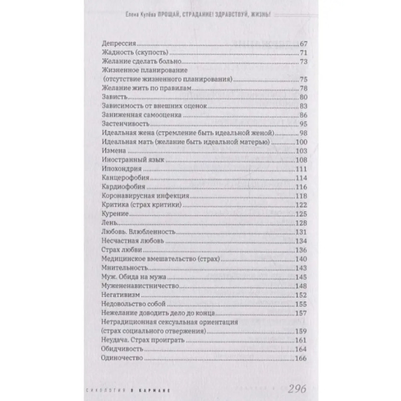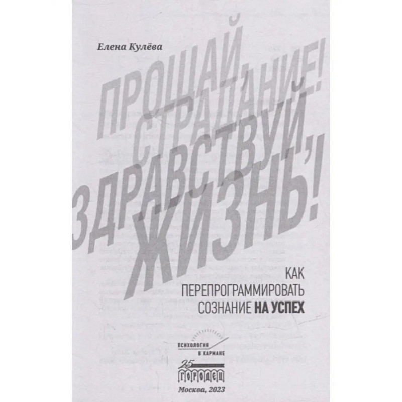 Прощай, страдание! Здравствуй, жизнь! Кулева Елена. Книга "Прощай, страдание! Здравствуй, жизнь!" является пособием по самопомощи. Она основана на написании прощального письма к симптому.Прощальное письмо к симптому это прием, предложенный Носсратом Пезешкианом, основателем метода позитивной психотерапии. Основная цель приема выработка у человека способности принятия травмирующего переживания или обстоятельства, благодаря чему снижается острота этого переживания. Такой прием помогает создать контрпрограмму для сознания.Письмо позволяет научиться рассматривать симптом как часть жизни, найти новые способы реагирования, активировать ресурсы для нового стиля адаптации к жизни. В книге изложена технология составления такого письма. Кроме того, в тексте представлены наиболее часто встречающиеся проблемы, с которыми обращаются за помощью к психологу.Читатель может использовать готовый текст письма, доработать его в соответствии со своей индивидуальностью или написать свое письмо.
