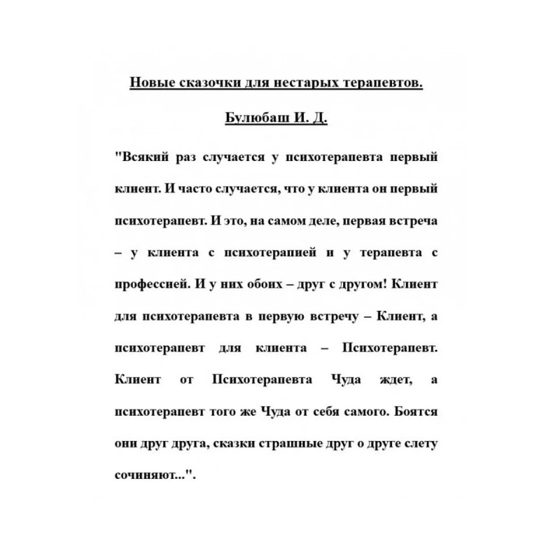 Новые сказочки для нестарых терапевтов. Булюбаш И. Д. "Всякий раз случается у психотерапевта первый клиент. И часто случается, что у клиента он первый психотерапевт. И это, на самом деле, первая встреча у клиента с психотерапией и у терапевта с профессией. И у них обоих друг с другом! Клиент для психотерапевта в первую встречу Клиент, а психотерапевт для клиента Психотерапевт. Клиент от Психотерапевта Чуда ждет, а психотерапевт того же Чуда от себя самого. Боятся они друг друга, сказки страшные друг о друге слету сочиняют..."