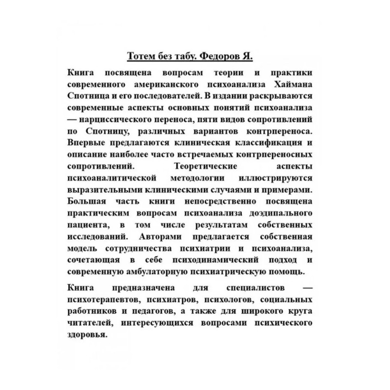 Тотем без табу. Федоров Я. Книга посвящена вопросам теории и практики современного американского психоанализа Хаймана Спотница и его последователей. В издании раскрываются современные аспекты основных понятий психоанализа нарциссического переноса, пяти видов сопротивлений по Спотницу, различных вариантов контрпереноса. Впервые предлагаются клиническая классификация и описание наиболее часто встречаемых контрпереносных сопротивлений. Теоретические аспекты психоаналитической методологии иллюстрируются выразительными клиническими случаями и примерами. Большая часть книги непосредственно посвящена практическим вопросам психоанализа доэдипального пациента, в том числе результатам собственных исследований. Авторами предлагается собственная модель сотрудничества психиатрии и психоанализа, сочетающая в себе психодинамический подход и современную амбулаторную психиатрическую помощь. Книга предназначена для специалистов психотерапевтов, психиатров, психологов, социальных работников и педагогов, а также для широкого круга читателей, интересующихся вопросами психического здоровья.