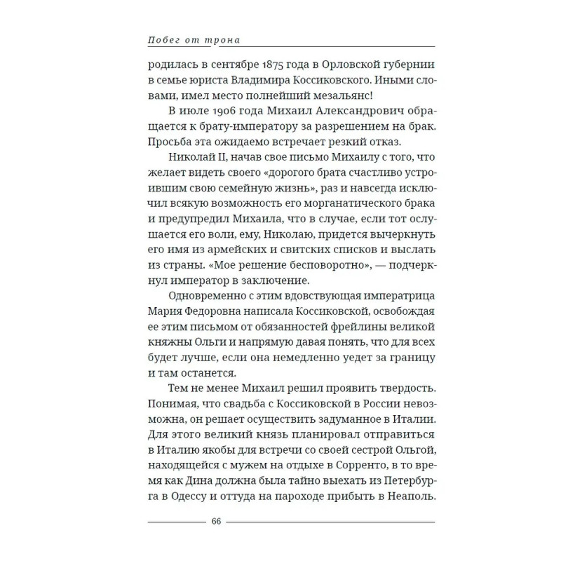 Брат последнего российского императора Николая II, великий князь Михаил Александрович Романов всегда оставался несколько в тени своего знаменитого родственника. В настоящем издании подробно рассказывается о жизни младшего Романова, начиная с рождения до последних дней. Его воспитание, отношение к наследованию престола, увлечения, личная жизнь, тайное венчание и многие другие эпизоды нашли отражение на страницах книги. Почему личная жизнь великого князя лишила его права на российский престол? О чём Михаил Александрович просил Николая II после начала Первой Мировой войны? Как жена князя назвала императрицу Марию Фёдоровну? Что писали газеты о похищении Михаила Романова? Опираясь на множество архивных документов, автор создал увлекательное повествование, дающее полное представление об этом представителе династии Романовых.
