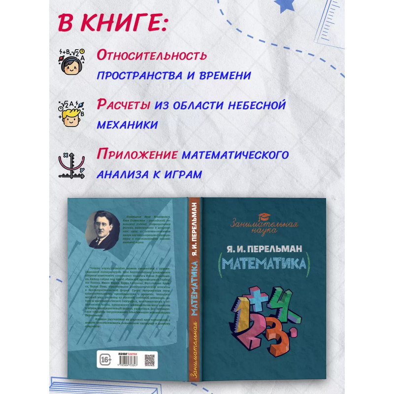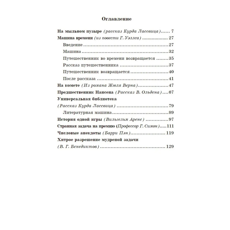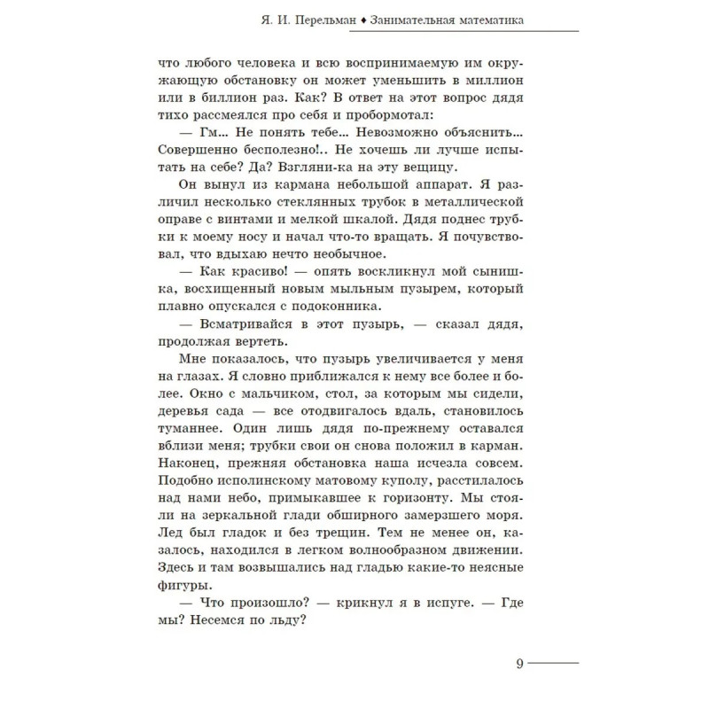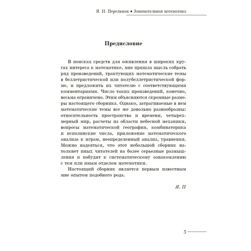 ISBN 978-5-6047533-4-7. Точная наука спокойно может уживаться с художественной литературой. Это блистательно доказывает сборник известного советского педагога Якова Перельмана. Автор собрал под одной обложкой произведения Герберта Уэллса, Жюля Верна, Курда Лассвица, Вильгельма Аренса, Барри Пэна, трактующие математические аспекты в беллетристической форме. Среди затронутых тем: относительность пространства и времени, четырехмерный мир, расчеты из области небесной механики, вопросы математической географии, комбинаторика и исполинские числа, приложение математического анализа к играм, неопределенный анализ, уравнения. Все прозаические отрывки сопровождают объясняющие комментарии Перельмана. Издание рассчитано на широкий круг читателей и может способствовать повышению интереса к данному предмету.
