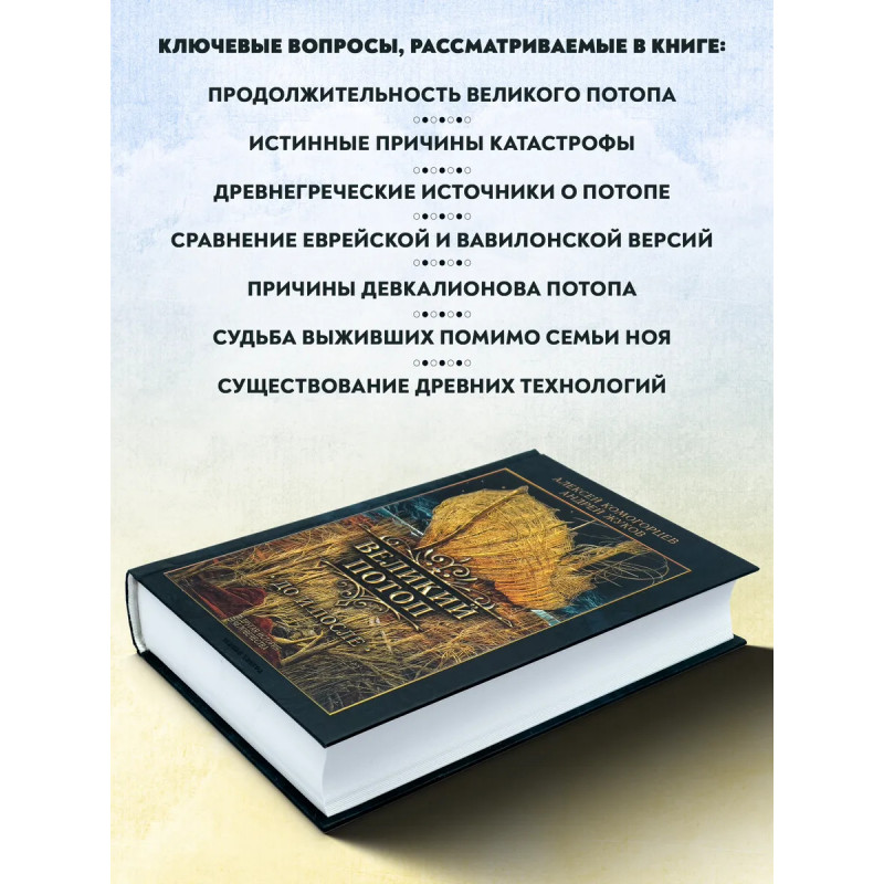 Великий потоп. Миф о Великом потопе является одной из ключевых общечеловеческих мифологем, берущих своё начало в глубокой праисторичской древности. Изучая допотопные и послепотопные времена можно сделать интересные, иногда даже сенсационные выводы о прошлом, настоящем и будущем человечества. Сколько времени длился Великий потоп? Каковы были его настоящие причины? Что рассказывается о потопах в древнегреческих источниках? Чем отличаются еврейская и вавилонская версии о потопе? Что было главной причиной Девкалионова потопа в древнегреческой мифологии? Только ли одному Ною и его семье удалось благополучно пережить воды Великого потопа? Существовали ли в древности высокие технологии? Авторы собрали и тщательно обработали основные доступные на сегодняшний день сведения, связанные с представлениями о потопе в традиционных религиозно-мифологических культурах человечества. Данные материалы проливают свет на подноготную современных социально-политических процессов и представляют несомненный интерес для самой широкой читательской аудитории.