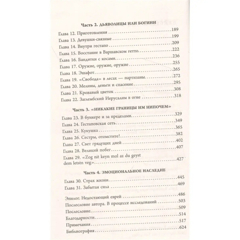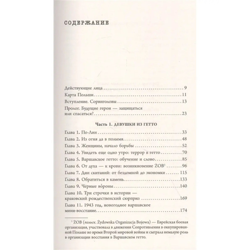 ISBN 9785171334925. Они были обычными женщинами, девушками и девочками-подростками... которым однажды пришлось увидеть, как жестоко убивают их родных и близких, познать голод, унижения и издевательства, оказаться за колючей проволокой польских гетто. Но они не смирились. Не сломались. Не сдались. И основали собственное движение Сопротивления, с которым не могли справиться даже "специалисты" из гестапо. Они не выбирали средств в борьбе против палачей своего народа в ход шло все, от взяток и флирта до метких выстрелов. Однако, наряду с успешными диверсиями и разведывательной деятельностью, эти юные еврейские девушки учили детей, присматривали за стариками, ухаживали за больными и ранеными...