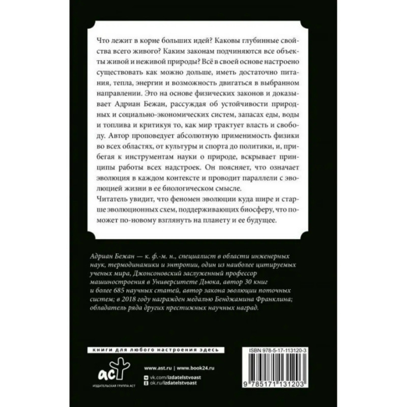 ISBN 9785-1711-31203. Физика жизни. Эволюция всего на свете. Бежан А. Что лежит в корне больших идей? Каковы глубинные свойства всего живого? Каким законам подчиняются все объекты живой и неживой природы? Все в своей основе настроено существовать как можно дольше, иметь достаточно питания, тепла, энергии и возможность двигаться в выбранном направлении. Это на основе физических законов и доказывает Адриан Бежан, рассуждая об устойчивости природных и социально-экономических систем, запасах еды, воды и топлива и критикуя то, как мир трактует власть и свободу. Автор проповедует абсолютную применимость физики во всех областях, от культуры и спорта до политики, и, прибегая к инструментам науки о природе, вскрывает принципы работы всех надстроек. Он поясняет, что означает эволюция в каждом контексте и проводит параллели с эволюцией жизни в ее биологическом смысле. Читатель увидит, что феномен эволюции куда шире и старше эволюционных схем, поддерживающих биосферу, что поможет по-новому взглянуть на планету и ее будущее.