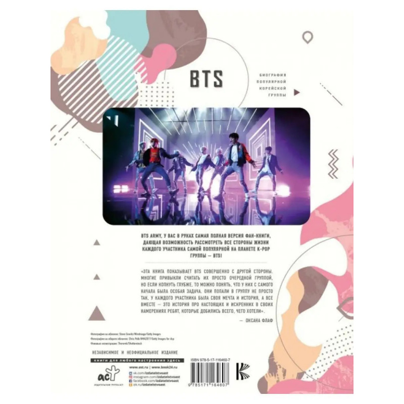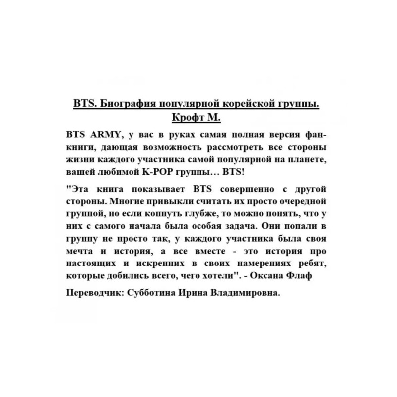 ISBN 9785-17116-4607. BTS. Биография популярной корейской группы. Крофт М. BTS. Биография популярной корейской группы. Крофт М. BTS ARMY, у вас в руках самая полная версия фан-книги, дающая возможность рассмотреть все стороны жизни каждого участника самой популярной на планете, вашей любимой K-POP группы BTS!"Эта книга показывает BTS совершенно с другой стороны. Многие привыкли считать их просто очередной группой, но если копнуть глубже, то можно понять, что у них с самого начала была особая задача. Они попали в группу не просто так, у каждого участника была своя мечта и история, а все вместе - это история про настоящих и искренних в своих намерениях ребят, которые добились всего, чего хотели". - Оксана ФлафПереводчик: Субботина Ирина Владимировна.