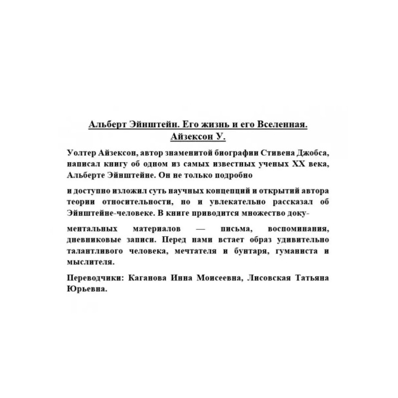 ISBN 9785-17079-6359. Альберт Эйнштейн. Его жизнь и его Вселенная. Альберт Эйнштейн. Его жизнь и его Вселенная. Айзексон У. Уолтер Айзексон, автор знаменитой биографии Стивена Джобса, написал книгу об одном из самых известных ученых XX века, Альберте Эйнштейне. Он не только подробнои доступно изложил суть научных концепций и открытий автора теории относительности, но и увлекательно рассказал об Эйнштейне-человеке. В книге приводится множество доку-ментальных материалов письма, воспоминания, дневниковые записи. Перед нами встает образ удивительно талантливого человека, мечтателя и бунтаря, гуманиста и мыслителя. Переводчики: Каганова Инна Моисеевна, Лисовская Татьяна Юрьевна.