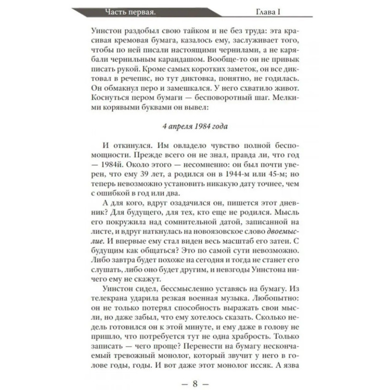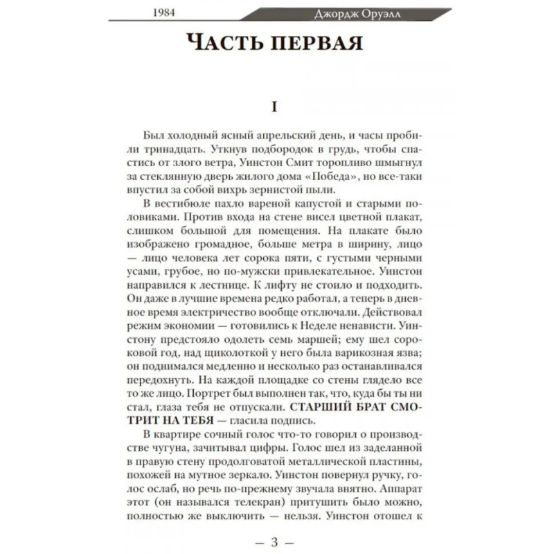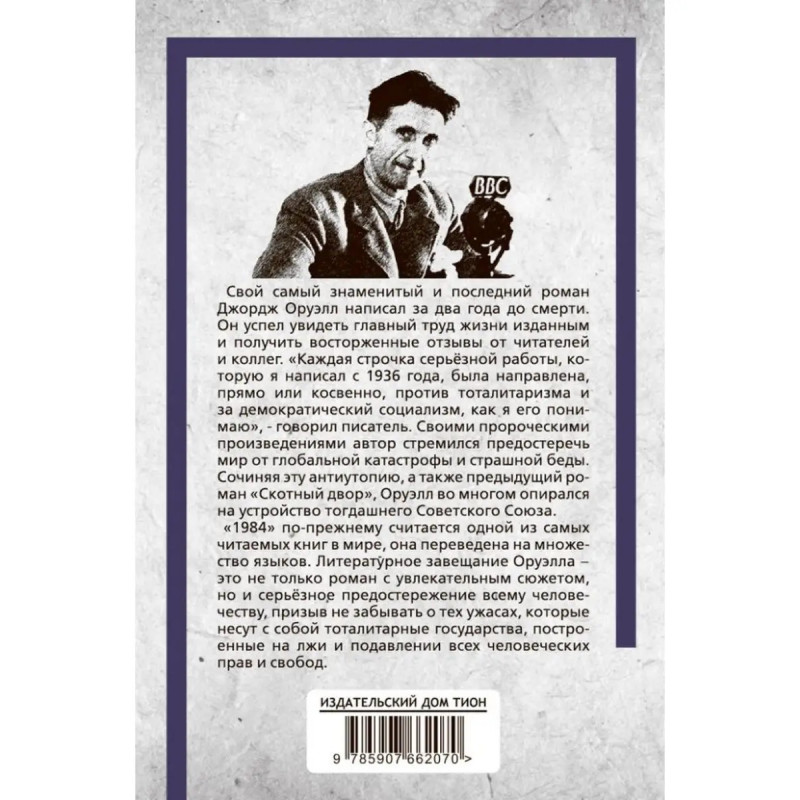 1984. Свой самый знаменитый и последний роман Джордж Оруэлл написал за два года до смерти. Он успел увидеть главный труд жизни изданным и получить восторженные отзывы от читателей и коллег. Каждая строчка серьёзной работы, которую я написал с 1936 года, была направлена, прямо или косвенно, против тоталитаризма и за демократический социализм, как я его понимаю, - говорил писатель. Своими пророческими произведениями автор стремился предостеречь мир от глобальной катастрофы и страшной беды. Сочиняя эту антиутопию, а также предыдущий роман Скотный двор, Оруэлл во многом опирался на устройство тогдашнего Советского Союза. 1984 по-прежнему считается одной из самых читаемых книг в мире, она переведена на множество языков. Литературное завещание Оруэлла это не только роман с увлекательным сюжетом, но и серьёзное предостережение всему человечеству, призыв не забывать о тех ужасах, которые несут с собой тоталитарные государства, построенные на лжи и подавлении всех человеческих прав и свобод.