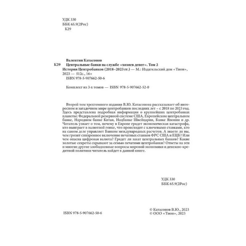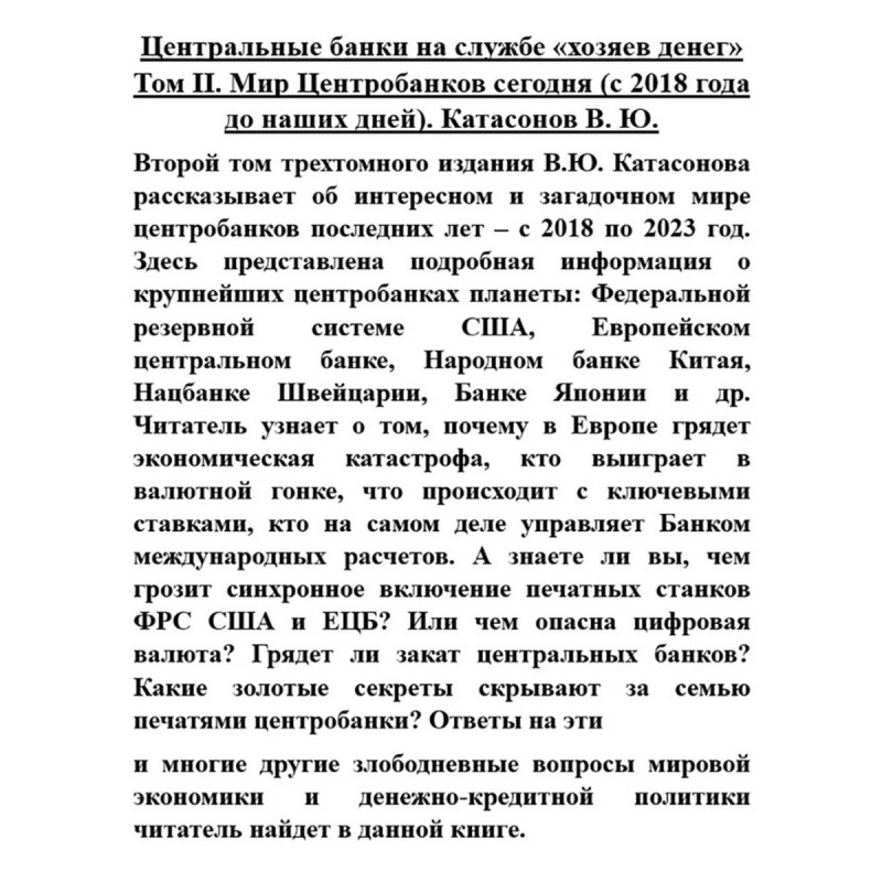 Центральные банки на службе "хозяев денег" Том II. Мир Центробанков сегодня (с 2018 года до наших дней). Катасонов В. Ю. Второй том трехтомного издания В. Ю. Катасонова рассказывает об интересном и загадочном мире центробанков последних лет с 2018 по 2023 год. Здесь представлена подробная информация о крупнейших центробанках планеты: Федеральной резервной системе США, Европейском центральном банке, Народном банке Китая, Нацбанке Швейцарии, Банке Японии и др. Читатель узнает о том, почему в Европе грядет экономическая катастрофа, кто выиграет в валютной гонке, что происходит с ключевыми ставками, кто на самом деле управляет Банком международных расчетов. А знаете ли вы, чем грозит синхронное включение печатных станков ФРС США и ЕЦБ? Или чем опасна цифровая валюта? Грядет ли закат центральных банков? Какие золотые секреты скрывают за семью печатями центробанки? Ответы на эти и многие другие злободневные вопросы мировой экономики и денежно-кредитной политики читатель найдет в данной книге.