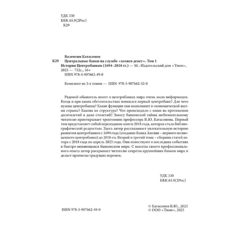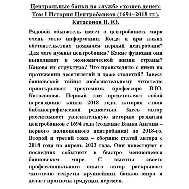 Центральные банки на службе "хозяев денег" Том I История Центробанков (1694 2018 гг. ). Катасонов В. Ю. Рядовой обыватель имеет о центробанках мира очень мало информации. Когда и при каких обстоятельствах появился первый центробанк? Для чего нужны центробанки? Какие функции они выполняют в экономической жизни страны? Какова их структура? Что происходило с ними на протяжении десятилетий и даже столетий? Завесу банковской тайны любознательному читателю приоткрывает трехтомник профессора В. Ю. Катасонова. Первый том представляет собой переиздание книги 2018 года, которая стала библиографической редкостью. Здесь автор рассказывает увлекательную историю развития центробанков с 1694 года (создание Банка Англии первого полноценного центробанка) до 2018-го. Второй и третий тома сборник статей автора с 2018 года по апрель 2023 года. Они повествуют о последних событиях в быстро меняющемся банковском мире. С высоты своего профессионального опыта автор раскрывает читателю секреты крупнейших банков мира и делает прогнозы грядущих перемен.