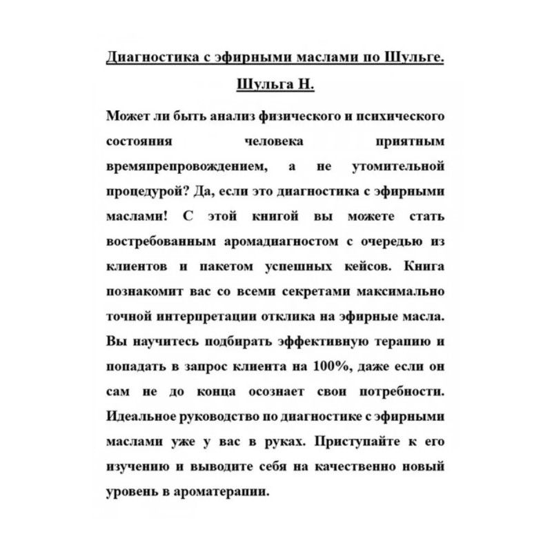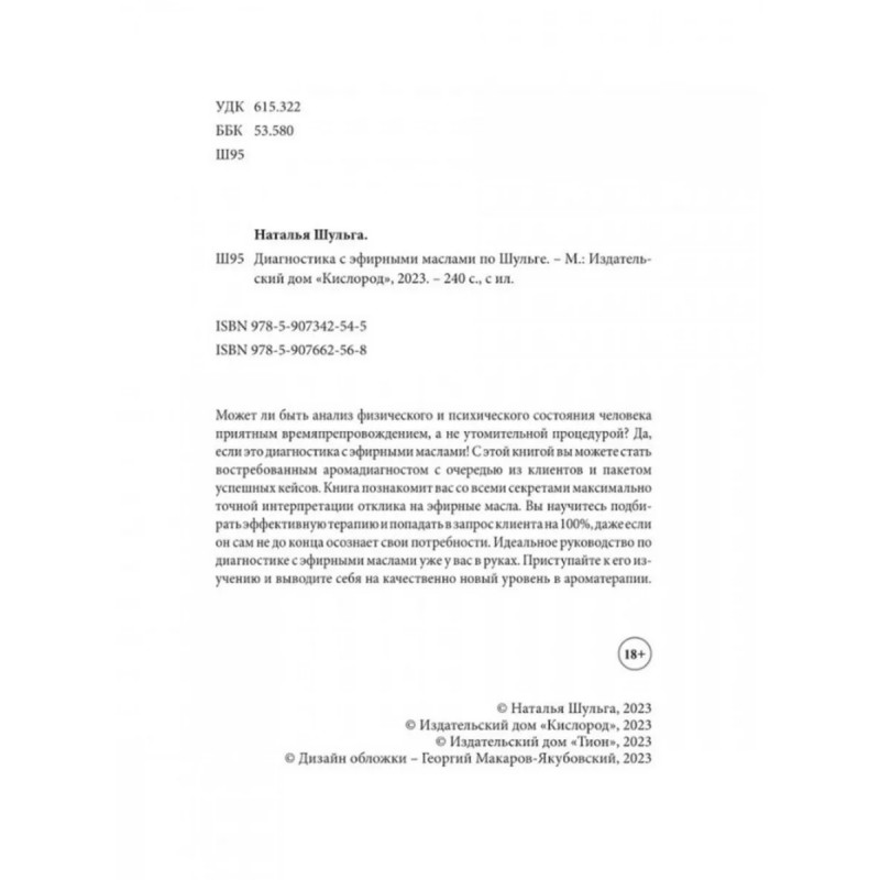 Диагностика с эфирными маслами по Шульге. Шульга Н. Может ли быть анализ физического и психического состояния человека приятным времяпрепровождением, а не утомительной процедурой? Да, если это диагностика с эфирными маслами! С этой книгой вы можете стать востребованным аромадиагностом с очередью из клиентов и пакетом успешных кейсов. Книга познакомит вас со всеми секретами максимально точной интерпретации отклика на эфирные масла. Вы научитесь подбирать эффективную терапию и попадать в запрос клиента на 100%, даже если он сам не до конца осознает свои потребности. Идеальное руководство по диагностике с эфирными маслами уже у вас в руках. Приступайте к его изучению и выводите себя на качественно новый уровень в ароматерапии.
