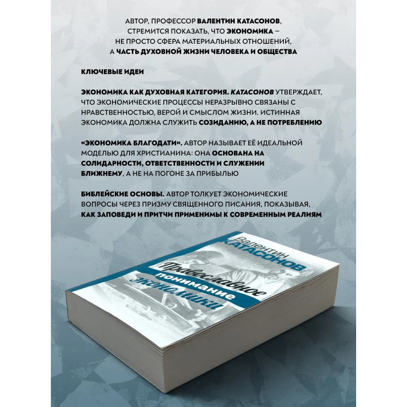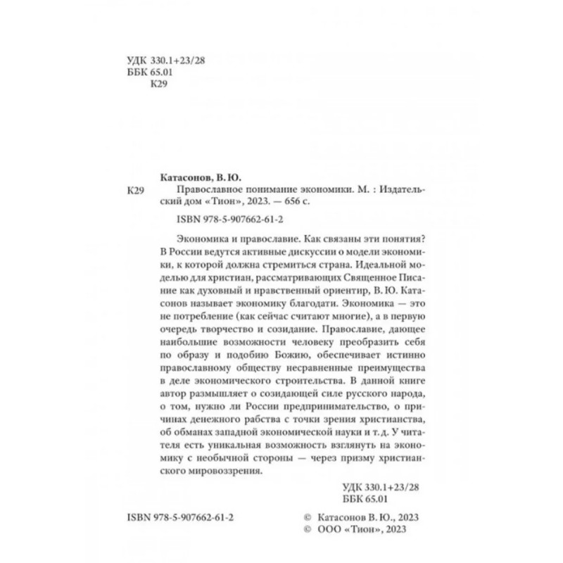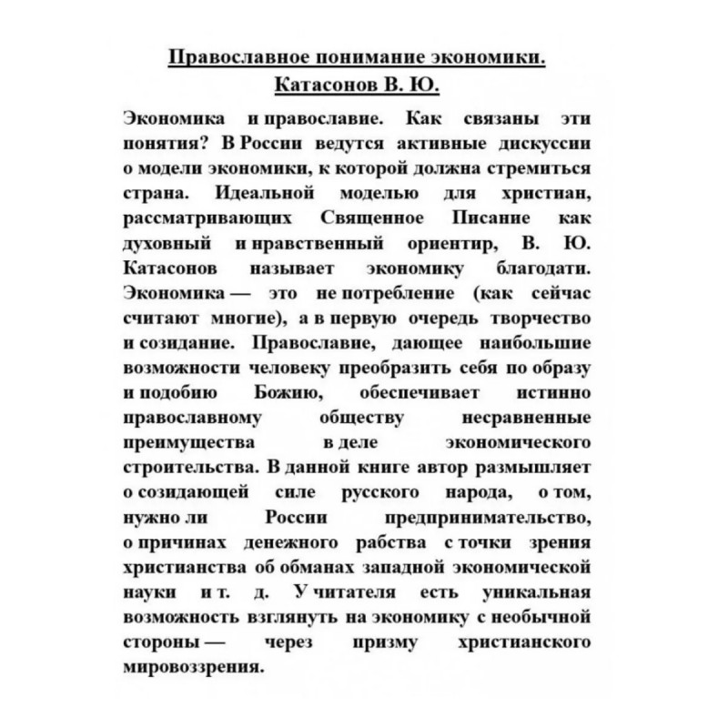 Православное понимание экономики. Катасонов В.Ю. Экономика и православие. Как связаны эти понятия? В России ведутся активные дискуссии о модели экономики, к которой должна стремиться страна. Идеальной моделью для христиан, рассматривающих Священное Писание как духовный и нравственный ориентир, В. Ю. Катасонов называет экономику благодати. Экономика это не потребление (как сейчас считают многие), а в первую очередь творчество и созидание. Православие, дающее наибольшие возможности человеку преобразить себя по образу и подобию Божию, обеспечивает истинно православному обществу несравненные преимущества в деле экономического строительства. В данной книге автор размышляет о созидающей силе русского народа, о том, нужно ли России предпринимательство, о причинах денежного рабства с точки зрения христианства об обманах западной экономической науки и т. д. У читателя есть уникальная возможность взглянуть на экономику с необычной стороны через призму христианского мировоззрения.