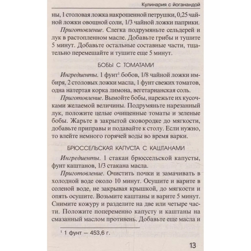 Кулинария с Йоганандой. Шри Йогананда. Готовьте пищу, сводя к минимуму количество ее составных частей, употребляемых за одной трапезой. Чем меньше видов продуктов вы употребляете за одной едой, тем лучше. Даже если вы едите фрукты, то лучше их ни с чем не смешивать. В действительности же частые приемы пищи, состоящие только из одного вида фруктов, являются очень удачной идеей. 3-е издание.
