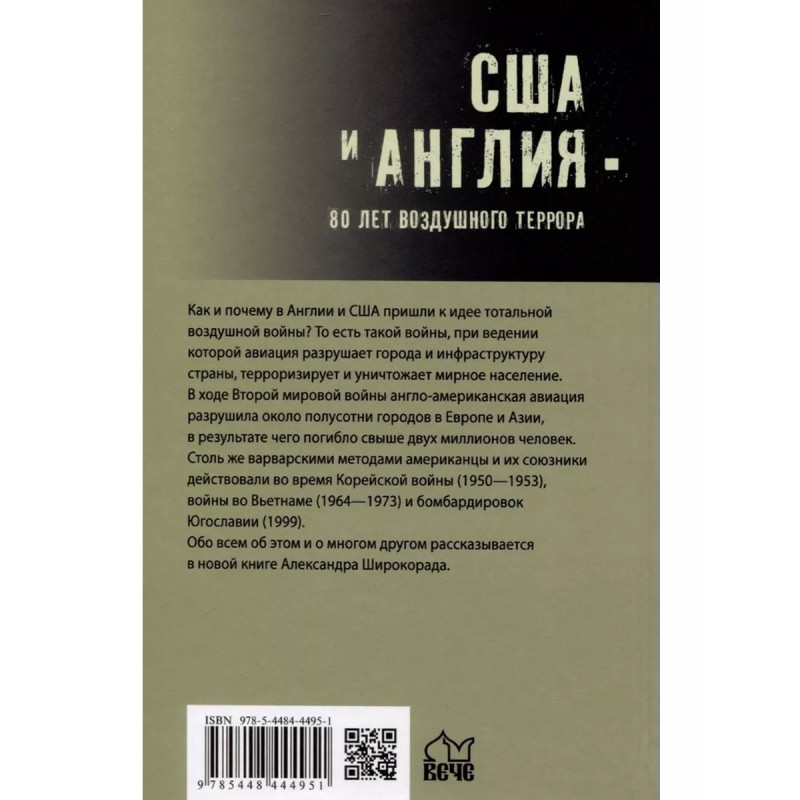 США и Англия - 80 лет воздушного террора. Широкорад А. Б. Как и почему в Англии и США пришли к идее тотальной воздушной войны? То есть такой войны, при ведении которой авиация разрушает города и инфраструктуру страны, терроризирует и уничтожает мирное население. В ходе Второй мировой войны англо-американская авиация разрушила около полусотни городов в Европе и Азии, в результате чего погибло свыше двух миллионов человек. Столь же варварскими методами американцы и их союзники действовали во время Корейской войны (19501953), войны во Вьетнаме (19641973) и бомбардировок Югославии (1999). Обо всем об этом и о многом другом рассказывается в новой книге Александра Широкорада.
