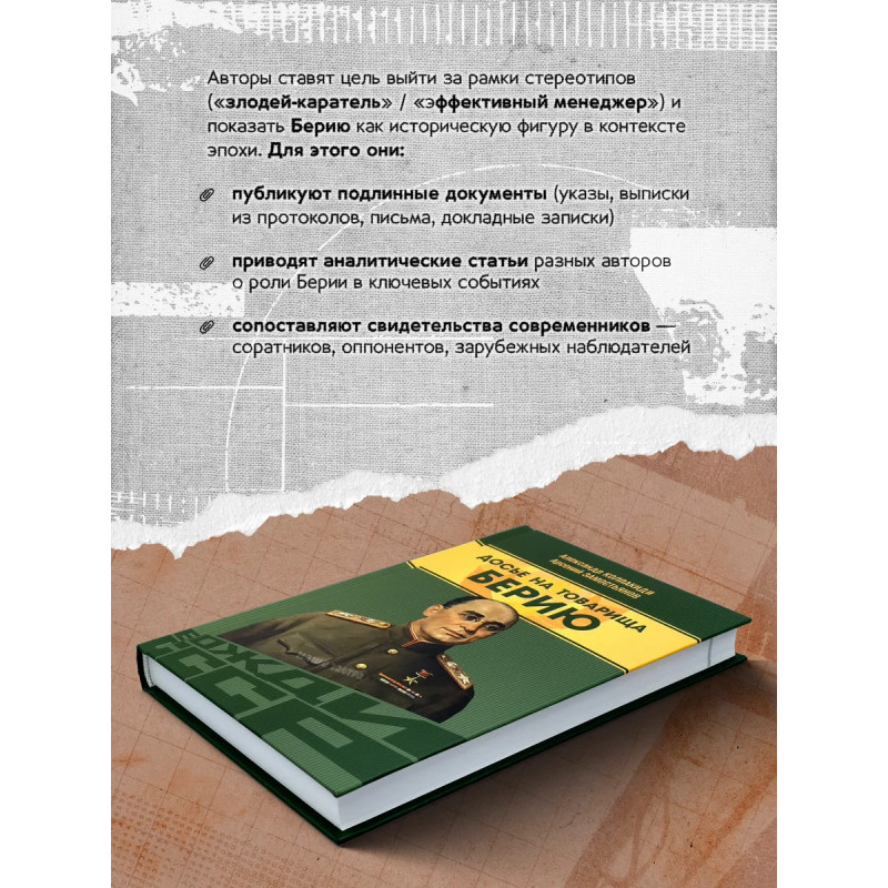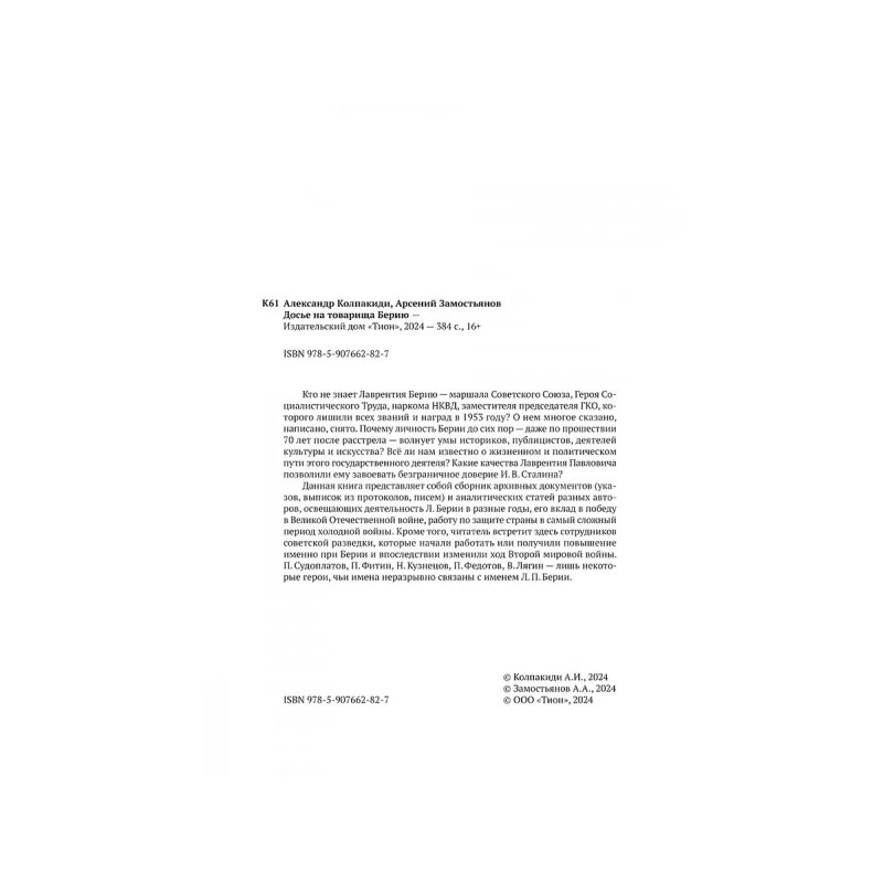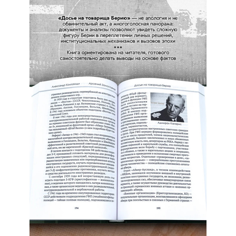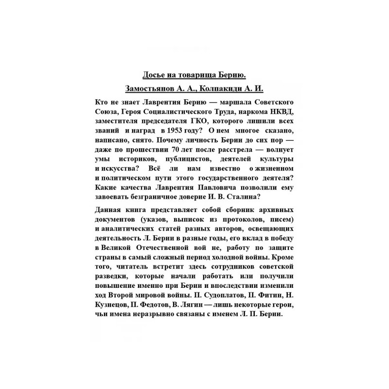 Досье на товарища Берию. Замостьянов А.А., Колпакиди А.И. Кто не знает Лаврентия Берию маршала Советского Союза, Героя Социалистического Труда, наркома НКВД, заместителя председателя ГКО, которого лишили всех званий и наград в 1953 году? О нем многое сказано, написано, снято. Почему личность Берии до сих пор даже по прошествии 70 лет после расстрела волнует умы историков, публицистов, деятелей культуры и искусства? Всё ли нам известно о жизненном и политическом пути этого государственного деятеля? Какие качества Лаврентия Павловича позволили ему завоевать безграничное доверие И. В. Сталина?Данная книга представляет собой сборник архивных документов (указов, выписок из протоколов, писем) и аналитических статей разных авторов, освещающих деятельность Л. Берии в разные годы, его вклад в победу в Великой Отечественной вой не, работу по защите страны в самый сложный период холодной войны. Кроме того, читатель встретит здесь сотрудников советской разведки, которые начали работать или получили повышение именно при Берии и впоследствии изменили ход Второй мировой войны. П. Судоплатов, П. Фитин, Н. Кузнецов, П. Федотов, В. Лягин лишь некоторые герои, чьи имена неразрывно связаны с именем Л. П. Берии.