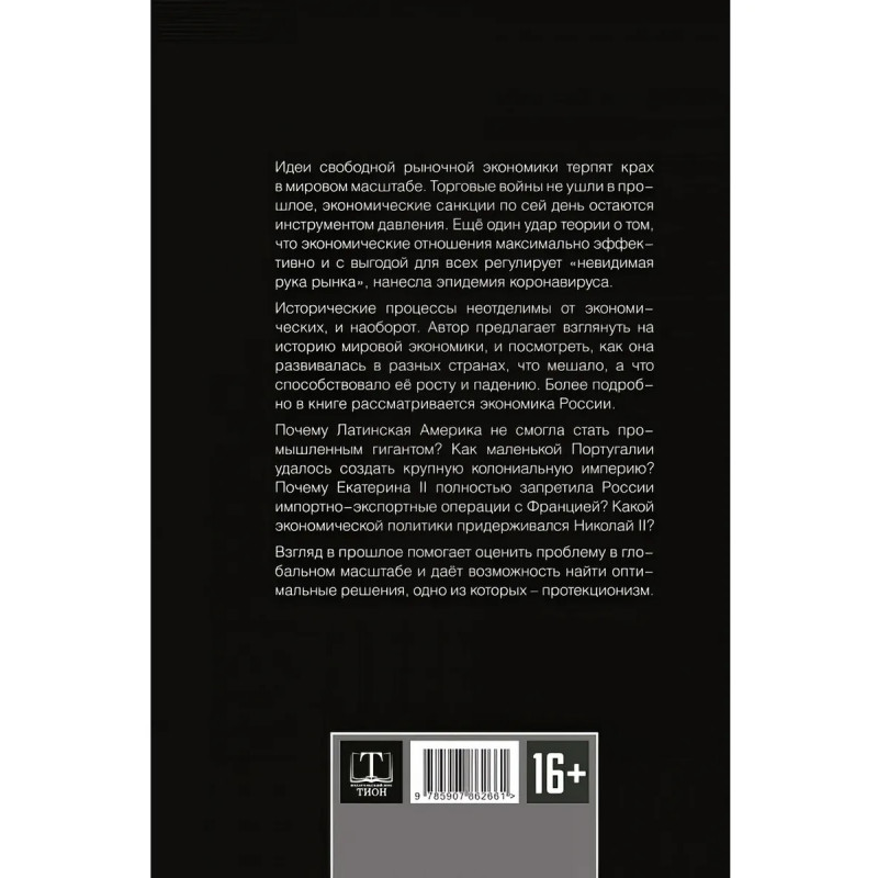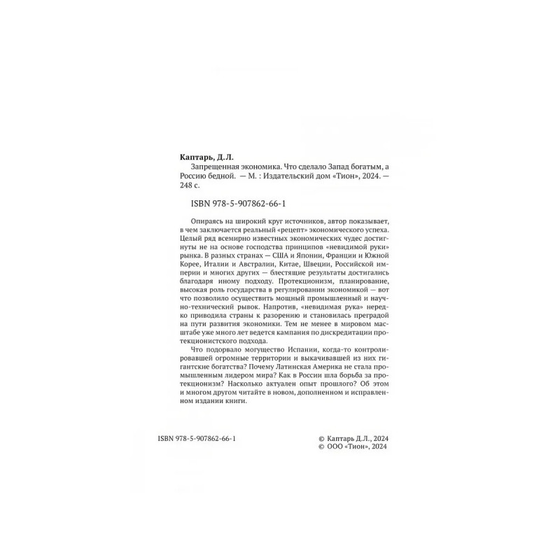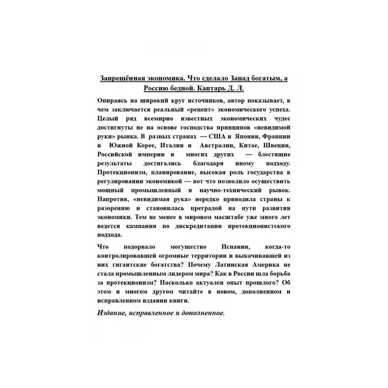 Запрещённая экономика. Что сделало Запад богатым, а Россию бедной. Издание исправленное и дополненное. Каптарь Д.Л. Опираясь на широкий круг источников, автор показывает, в чем заключается реальный "рецепт" экономического успеха. Целый ряд всемирно известных экономических чудес достигнуты не на основе господства принципов "невидимой руки" рынка. В разных странах США и Японии, Франции и Южной Корее, Италии и Австралии, Китае, Швеции, Российской империи и многих других блестящие результаты достигались благодаря иному подходу. Протекционизм, планирование, высокая роль государства в регулировании экономикой вот что позволило осуществить мощный промышленный и научно-технический рывок. Напротив, "невидимая рука" нередко приводила страны к разорению и становилась преградой на пути развития экономики. Тем не менее в мировом масштабе уже много лет ведется кампания по дискредитации протекционистского подхода.Что подорвало могущество Испании, когда-то контролировавшей огромные территории и выкачивавшей из них гигантские богатства? Почему Латинская Америка не стала промышленным лидером мира? Как в России шла борьба за протекционизм? Насколько актуален опыт прошлого? Об этом и многом другом читайте в новом, дополненном и исправленном издании книги.Издание, исправленное и дополненное.