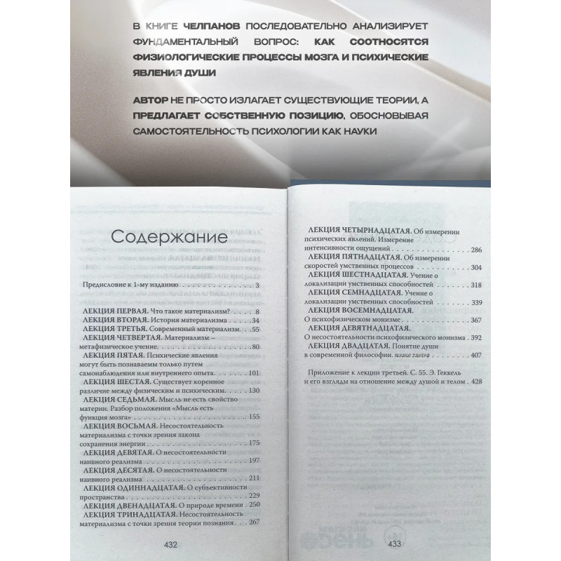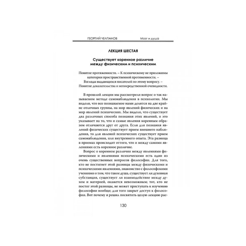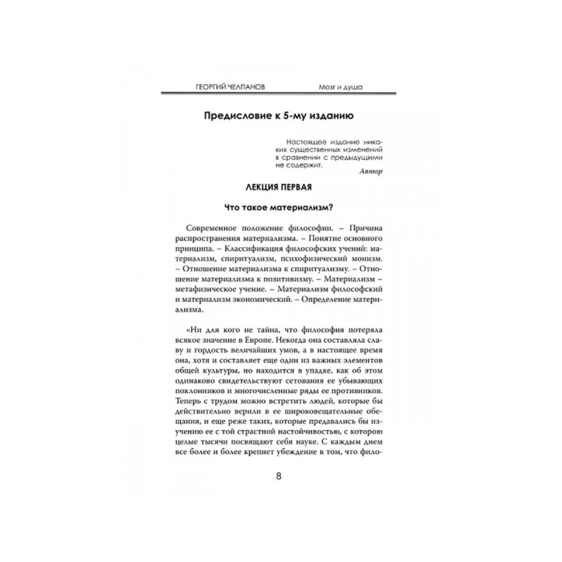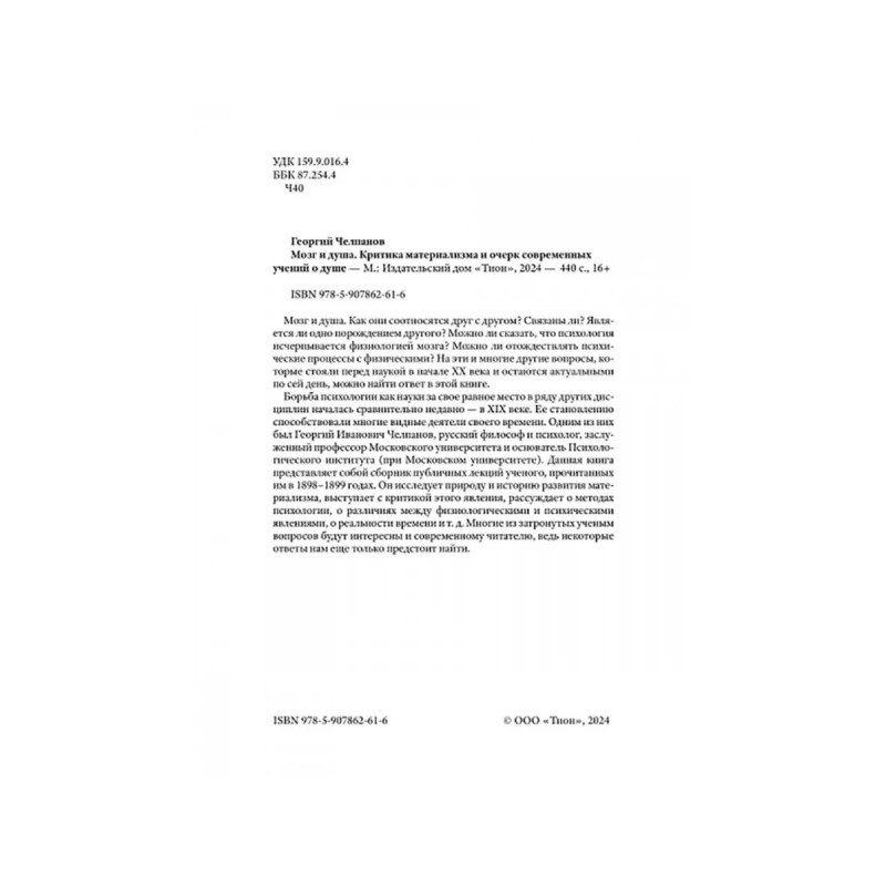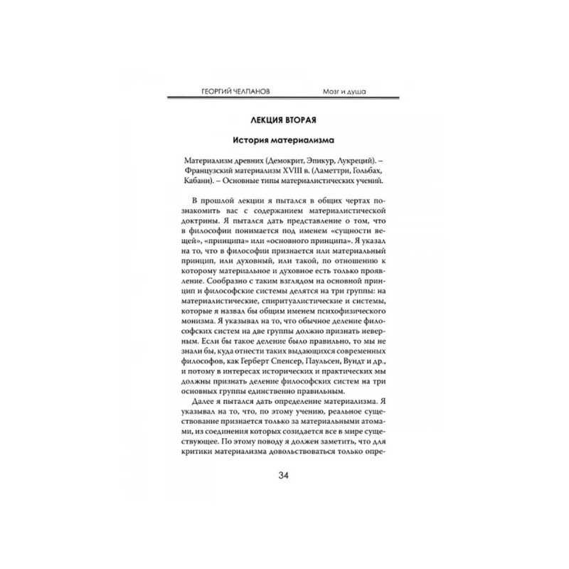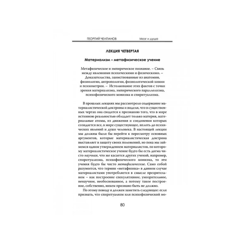 Мозг и душа. Критика материализма и очерк современных учений о душе. Челпанов Г. И. Мозг и душа. Как они соотносятся друг с другом? Связаны ли? Является ли одно порождением другого? Можно ли сказать, что психология исчерпывается физиологией мозга? Можно ли отождествлять психические процессы с физическими? На эти и многие другие вопросы, которые стояли перед наукой в начале XX века и остаются актуальными по сей день, можно найти ответ в этой книге. Борьба психологии как науки за свое равное место в ряду других дисциплин началась сравнительно недавно в XIX веке. Ее становлению способствовали многие видные деятели своего времени. Одним из них был Георгий Иванович Челпанов, русский философ и психолог, заслуженный профессор Московского университета и основатель Психологического института (при Московском университете). Данная книга представляет собой сборник публичных лекций ученого, прочитанных им в 1898 1899 годах. Он исследует природу и историю развития материализма, выступает с критикой этого явления, рассуждает о методах психологии, о различиях между физиологическими и психическими явлениями, о реальности времени и т. д. Многие из затронутых ученым вопросов будут интересны и современному читателю, ведь некоторые ответы нам еще только предстоит найти.