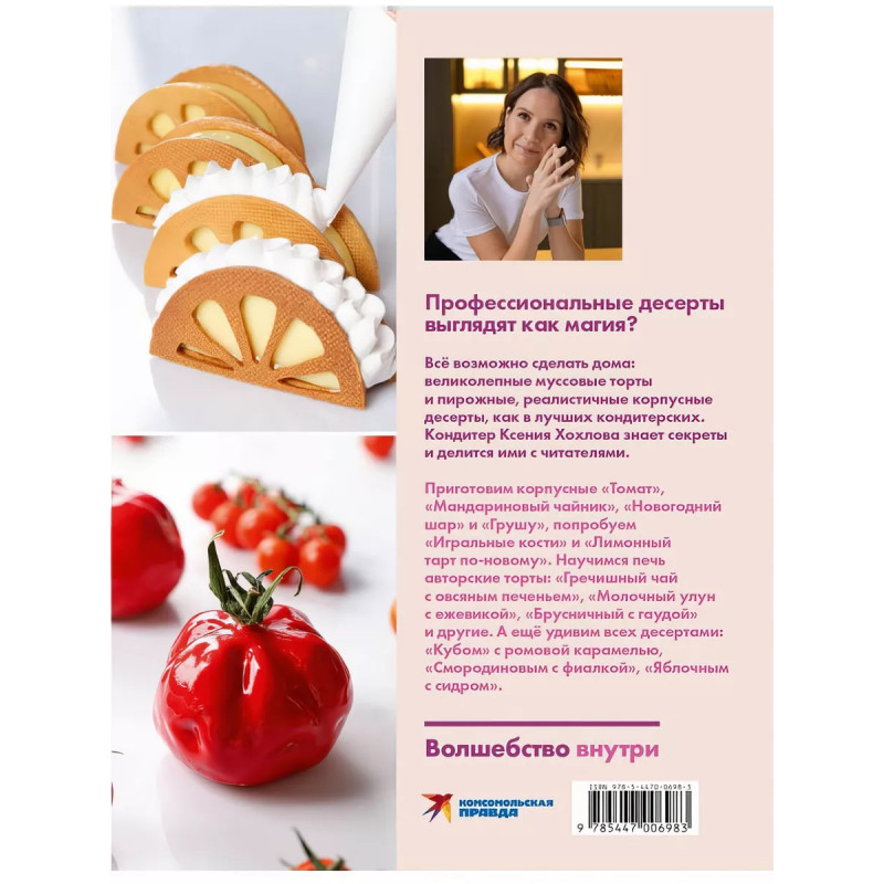 Будет сладко. Корпусные десерты, тарты, муссовые торты и пирожные. Хохлова К. Профессиональные десерты выглядят как магия? Всё возможно сделать дома: великолепные муссовые торты и пирожные, реалистичные корпусные десерты, как в лучших кондитерских. Кондитер Ксения Хохлова знает невероятные секреты мастерства и щедро делится ими с читателями. Приготовим корпусные "Томат", "Мандариновый чайник", "Новогодний шар" и "Грушу" - оттенки вкусов поразят даже искушенных гурманов. Попробуем оригинальные "Игральные кости" и "Лимонный тарт по-новому". Научимся печь авторские торты: "Гречишный чай с овсяным печеньем", "Молочный улун с ежевикой", "Брусничный с гаудой" и другие. Удивим сладкоежек десертами: "Кубом" с ромовой карамелью, "Смородиновым с фиалкой", "Яблочным с сидром". Сладкое волшебство - внутри книги и пирожных!
