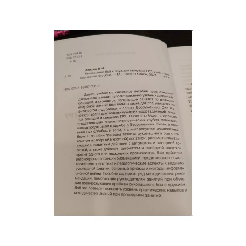 Рукопашный бой с оружием спецназа ГРУ. Авилов В. И. Данное учебно-методическое пособие предназначено для военнослужащих, курсантов военно-учебных заведений, офицеров и сержантов, проводящих занятия по рукопашному бою с личным составом, а также для специалистов по физической подготовке и спорту Вооруженных Сил РФ, прежде всего для военнослужащих подразделений военной разведки и спецназа ГРУ. Также оно будет интересно представителям военно-патриотических клубов, занимающимся подготовкой к службе в Вооруженных Силах и специальных службах, и всем, кто интересуется рукопашным боем. В пособии показана техника рукопашного боя с автоматом и сапёрной (пехотной) лопаткой, а также действия с автоматом и сапёрной лопаткой против одного или нескольких противников. Все действия рассмотрены с позиции биомеханики, представлены психологическая подготовка и педагогические аспекты к ведению рукопашной схватки, основные приемы и методы информационной войны. Пособие содержит ряд методических рекомендаций, помогающих руководителям занятий при обучении военнослужащих приёмам рукопашного боя с оружием. Всё это позволит повысить уровень практических навыков и методических знаний при проведении занятий.