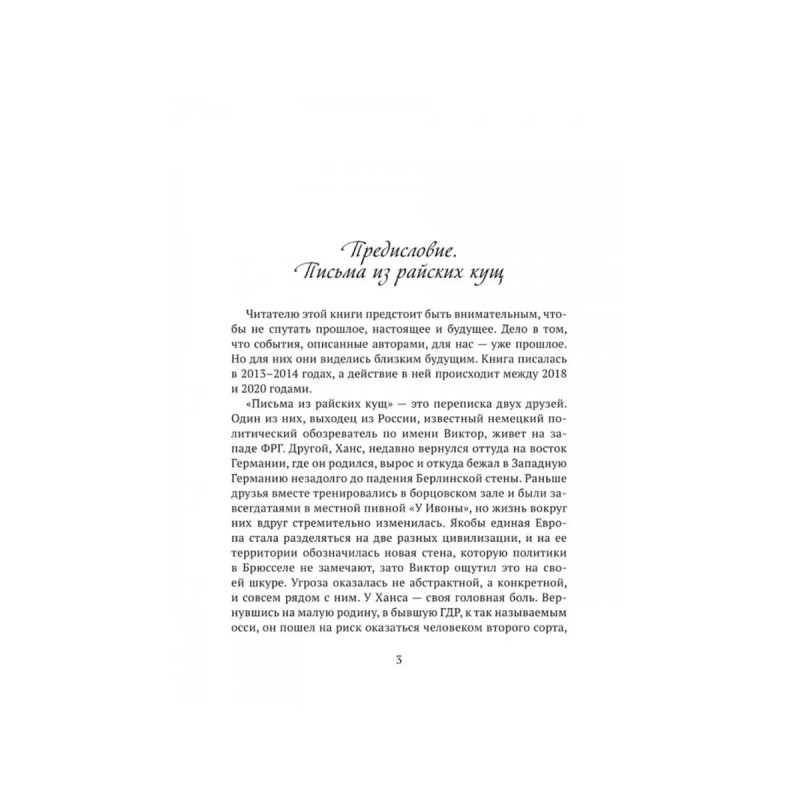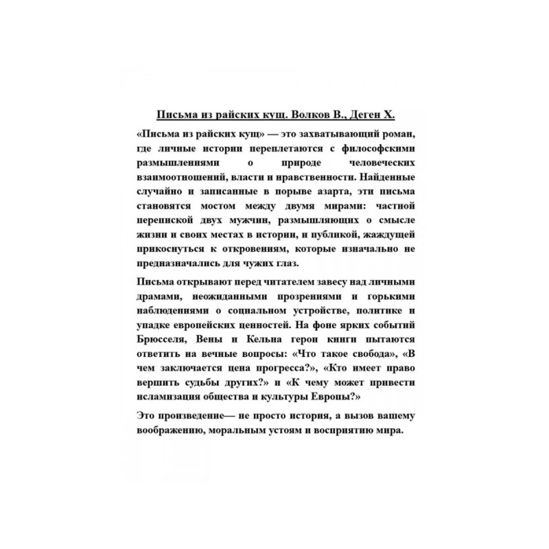 Письма из райских кущ. Волков В., Деген Х."Письма из райских кущ" это захватывающий роман, где личные истории переплетаются с философскими размышлениями о природе человеческих взаимоотношений, власти и нравственности. Найденные случайно и записанные в порыве азарта, эти письма становятся мостом между двумя мирами: частной перепиской двух мужчин, размышляющих о смысле жизни и своих местах в истории, и публикой, жаждущей прикоснуться к откровениям, которые изначально не предназначались для чужих глаз. Письма открывают перед читателем завесу над личными драмами, неожиданными прозрениями и горькими наблюдениями о социальном устройстве, политике и упадке европейских ценностей. На фоне ярких событий Брюсселя, Вены и Кельна герои книги пытаются ответить на вечные вопросы: "Что такое свобода", "В чем заключается цена прогресса?", "Кто имеет право вершить судьбы других?" и "К чему может привести исламизация общества и культуры Европы?"Это произведение не просто история, а вызов вашему воображению, моральным устоям и восприятию мира.