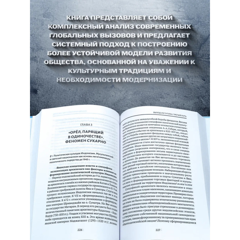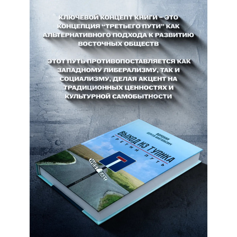Выход из тупика. Третий путь. Воронин С. А."Выход из тупика: Третий путь" исследует кризис современной западной цивилизации, её социальной, экономической и политической модели, демонстрирующей несостоятельность перед вызовами глобализации. Автор Сергей Воронин анализирует феномен концепции "третьего пути" как альтернативного подхода к развитию обществ Востока, основываясь на традиционных ценностях и самобытности, противопоставленных западному либерализму и социализму. В книге раскрывается влияние глобализации, демократического транзита и модернизации на восточные общества, а также их стремление к эндогенному развитию, поддержанному примерами доктрин политического лидерства XX века. Работа поднимает важные вопросы о путях выхода из мирового кризиса и возможностях построения устойчивой модели управления на основе синтеза культурных и социальных традиций с элементами модернизации.