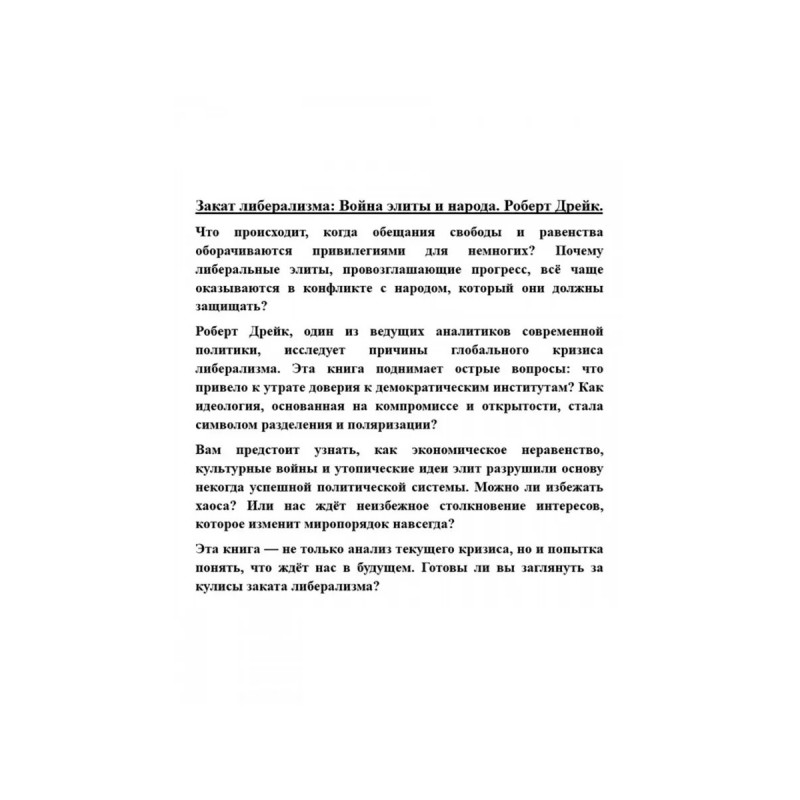 Закат либерализма: Война элиты и народа. Роберт Дрейк. Что происходит, когда обещания свободы и равенства оборачиваются привилегиями для немногих? Почему либеральные элиты, провозглашающие прогресс, всё чаще оказываются в конфликте с народом, который они должны защищать?Роберт Дрейк, один из ведущих аналитиков современной политики, исследует причины глобального кризиса либерализма. Эта книга поднимает острые вопросы: что привело к утрате доверия к демократическим институтам? Как идеология, основанная на компромиссе и открытости, стала символом разделения и поляризации?Вам предстоит узнать, как экономическое неравенство, культурные войны и утопические идеи элит разрушили основу некогда успешной политической системы. Можно ли избежать хаоса? Или нас ждёт неизбежное столкновение интересов, которое изменит миропорядок навсегда?Эта книга не только анализ текущего кризиса, но и попытка понять, что ждёт нас в будущем. Готовы ли вы заглянуть за кулисы заката либерализма?