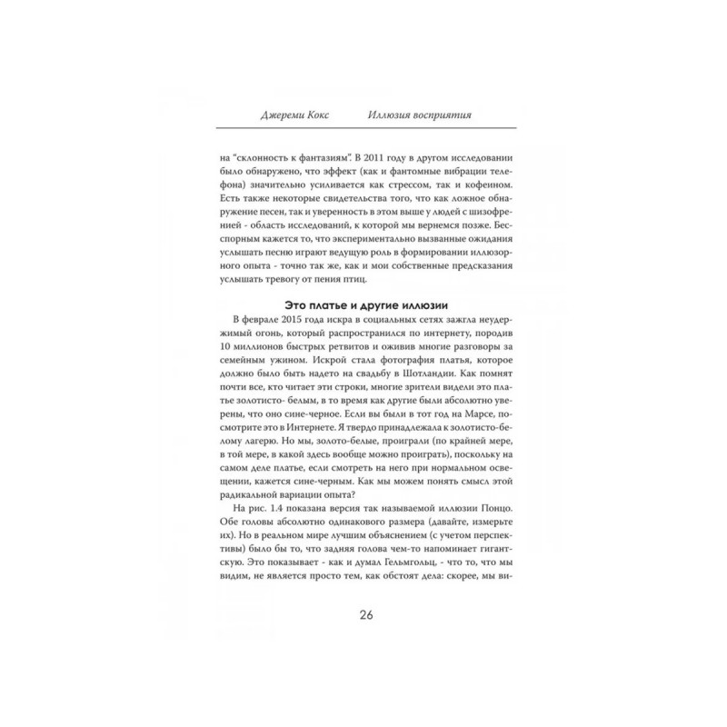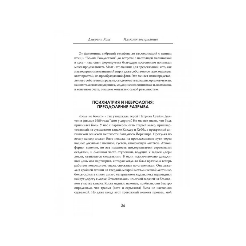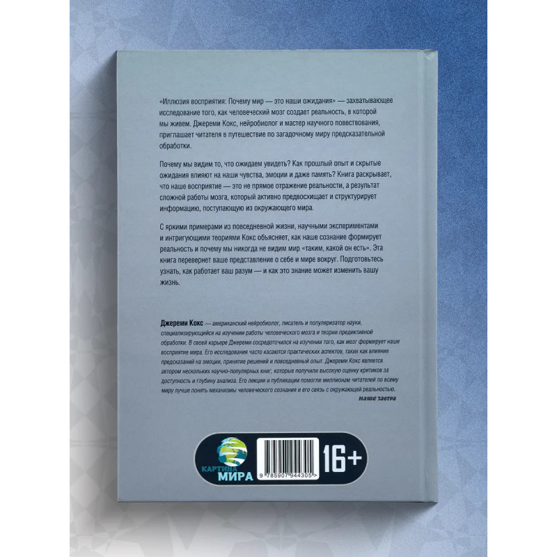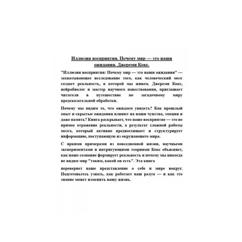 Иллюзия восприятия. Почему мир это наши ожидания. Джереми Кокс."Иллюзия восприятия: Почему мир это наши ожидания" захватывающее исследование того, как человеческий мозг создает реальность, в которой мы живем. Джереми Кокс, нейробиолог и мастер научного повествования, приглашает читателя в путешествие по загадочному миру предсказательной обработки. Почему мы видим то, что ожидаем увидеть? Как прошлый опыт и скрытые ожидания влияют на наши чувства, эмоции и даже память? Книга раскрывает, что наше восприятие это не прямое отражение реальности, а результат сложной работы мозга, который активно предвосхищает и структурирует информацию, поступающую из окружающего мира. С яркими примерами из повседневной жизни, научными экспериментами и интригующими теориями Кокс объясняет, как наше сознание формирует реальность и почему мы никогда не видим мир "таким, какой он есть". Эта книгаперевернет ваше представление о себе и мире вокруг. Подготовьтесь узнать, как работает ваш разум и как это знание может изменить вашу жизнь.