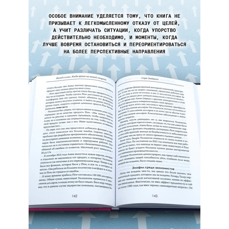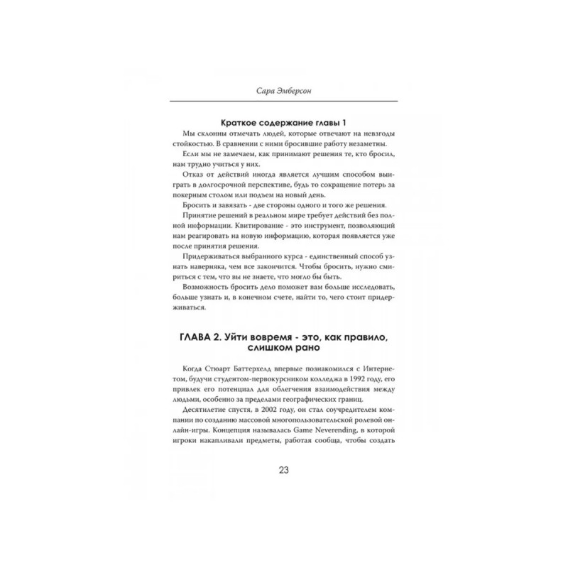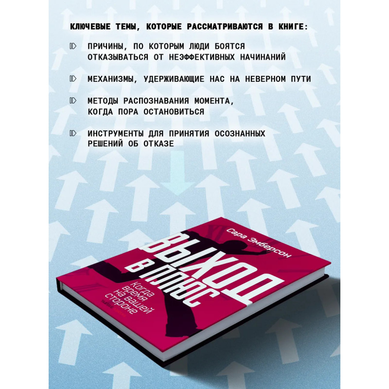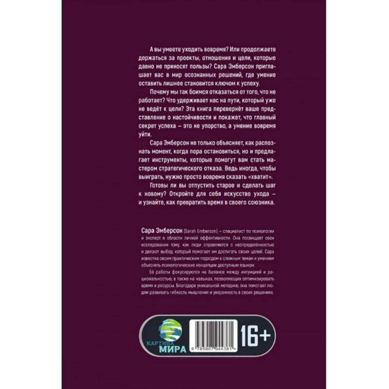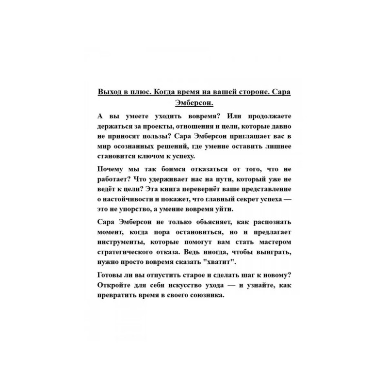 Выход в плюс. Когда время на вашей стороне. Сара Эмберсон. А вы умеете уходить вовремя? Или продолжаете держаться за проекты, отношения и цели, которые давно не приносят пользы? Сара Эмберсон приглашает вас в мир осознанных решений, где умение оставить лишнее становится ключом к успеху. Почему мы так боимся отказаться от того, что не работает? Что удерживает нас на пути, который уже не ведёт к цели? Эта книга перевернёт ваше представление о настойчивости и покажет, что главный секрет успеха это не упорство, а умение вовремя уйти. Сара Эмберсон не только объясняет, как распознать момент, когда пора остановиться, но и предлагает инструменты, которые помогут вам стать мастером стратегического отказа. Ведь иногда, чтобы выиграть, нужно просто вовремя сказать "хватит". Готовы ли вы отпустить старое и сделать шаг к новому? Откройте для себя искусство ухода и узнайте, как превратить время в своего союзника.