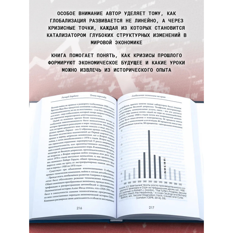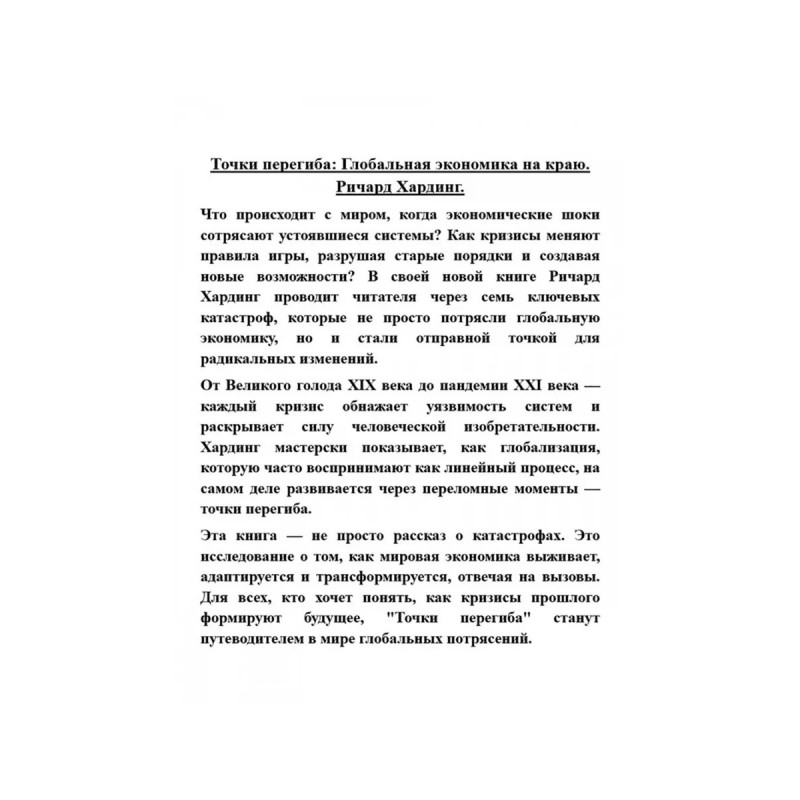 Точки перегиба: Глобальная экономика на краю. Ричард Хардинг. Что происходит с миром, когда экономические шоки сотрясают устоявшиеся системы? Как кризисы меняют правила игры, разрушая старые порядки и создавая новые возможности? В своей новой книге Ричард Хардинг проводит читателя через семь ключевых катастроф, которые не просто потрясли глобальную экономику, но и стали отправной точкой для радикальных изменений. От Великого голода XIX века до пандемии XXI века каждый кризис обнажает уязвимость систем и раскрывает силу человеческой изобретательности. Хардинг мастерски показывает, как глобализация, которую часто воспринимают как линейный процесс, на самом деле развивается через переломные моменты точки перегиба. Эта книга не просто рассказ о катастрофах. Это исследование о том, как мировая экономика выживает, адаптируется и трансформируется, отвечая на вызовы. Для всех, кто хочет понять, как кризисы прошлого формируют будущее, "Точки перегиба" станут путеводителем в мире глобальных потрясений.