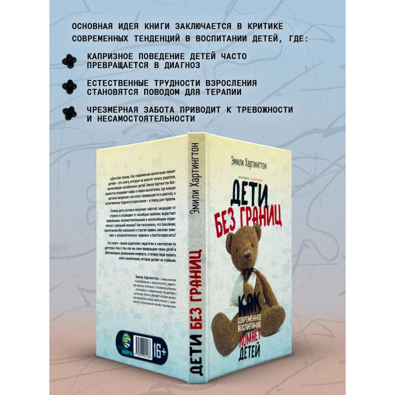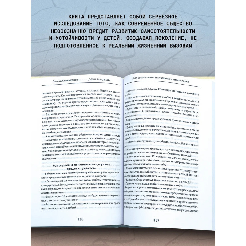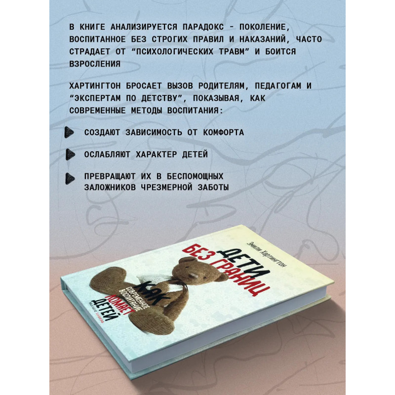 Дети без границ. Как современное воспитание ломает детей. Эмили Хартингтон."Дети без границ. Как современное воспитание ломает детей" это книга, которую не захотят читать родители, воспитавшие "особенных" детей. Эмили Хартингтон безжалостно вскрывает мифы о новом воспитании, где каждое детское капризное "не хочу" превращаться в диагноз, а естественные трудности взросления в повод для терапии. Почему дети, которых окружают заботой, защищают от стресса и ограждают от малейших проблем, вырастают тревожными, несамостоятельными и неспособными справляться с реальной жизнью? Как получилось, что поколение, воспитанное без наказаний и строгих правил, массово заявляет о "психологических травмах" и боится взрослеть?Эта книга вызов родителям, педагогам и "экспертам по детству". Она о том, как мы сами превращаем своих детей в беспомощных заложников комфорта, и почему пора сказать "нет" воспитанию, которое делает их слабыми.