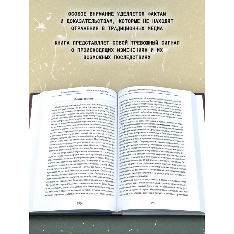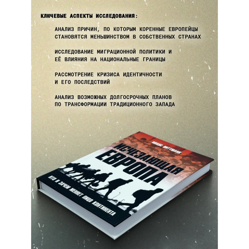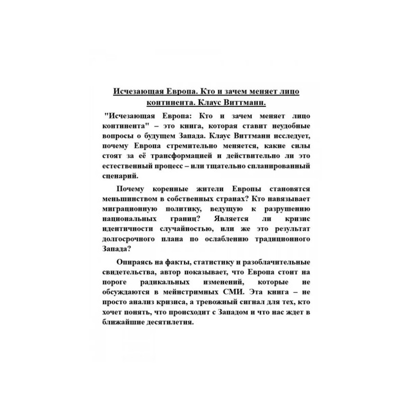 Исчезающая Европа. Кто и зачем меняет лицо континента. Клаус Виттманн. "Исчезающая Европа: Кто и зачем меняет лицо континента" это книга, которая ставит неудобные вопросы о будущем Запада. Клаус Виттманн исследует, почему Европа стремительно меняется, какие силы стоят за её трансформацией и действительно ли это естественный процесс или тщательно спланированный сценарий. Почему коренные жители Европы становятся меньшинством в собственных странах? Кто навязывает миграционную политику, ведущую к разрушению национальных границ? Является ли кризис идентичности случайностью, или же это результат долгосрочного плана по ослаблению традиционного Запада? Опираясь на факты, статистику и разоблачительные свидетельства, автор показывает, что Европа стоит на пороге радикальных изменений, которые не обсуждаются в мейнстримных СМИ. Эта книга не просто анализ кризиса, а тревожный сигнал для тех, кто хочет понять, что происходит с Западом и что нас ждет в ближайшие десятилетия.