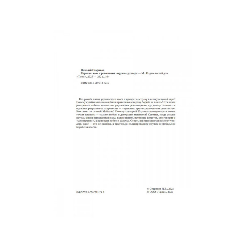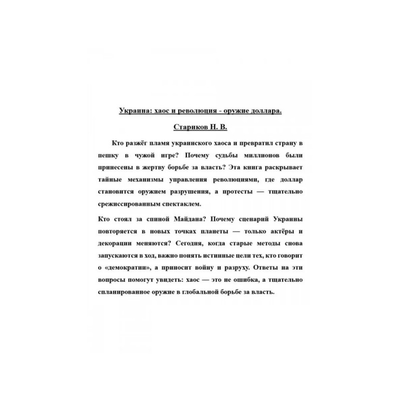Украина: хаос и революция - оружие доллара. Стариков Н. В. Кто разжёг пламя украинского хаоса и превратил страну в пешку в чужой игре? Почему судьбы миллионов были принесены в жертву борьбе за власть? Эта книга раскрывает тайные механизмы управления революциями, где доллар становится оружием разрушения, а протесты тщательно срежиссированным спектаклем. Кто стоял за спиной Майдана? Почему сценарий Украины повторяется в новых точках планеты только актёры и декорации меняются? Сегодня, когда старые методы снова запускаются в ход, важно понять истинные цели тех, кто говорит о демократии, а приносит войну и разруху. Ответы на эти вопросы помогут увидеть: хаос это не ошибка, а тщательно спланированное оружие в глобальной борьбе за власть.