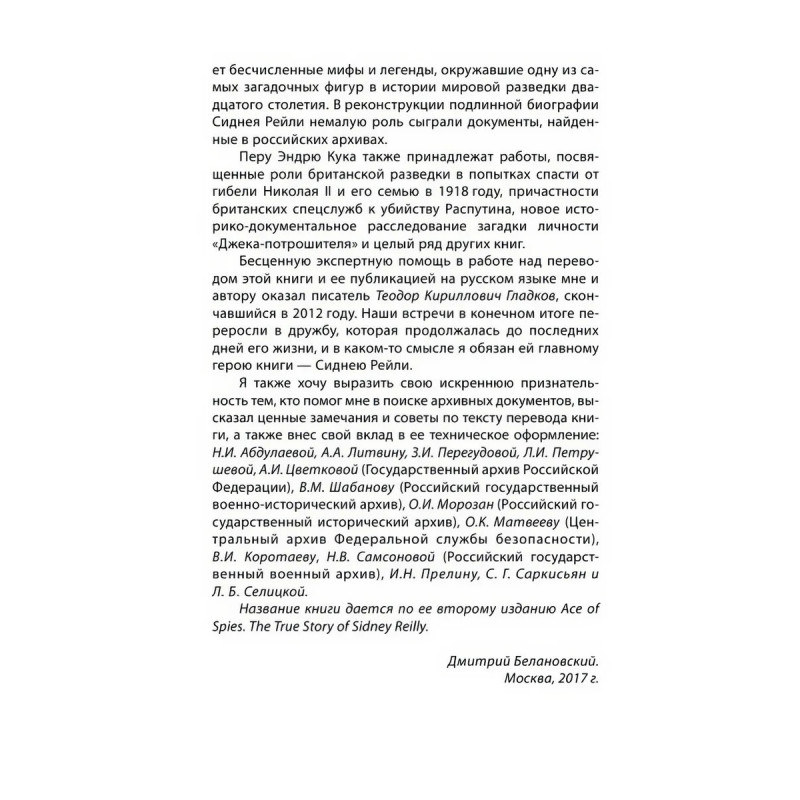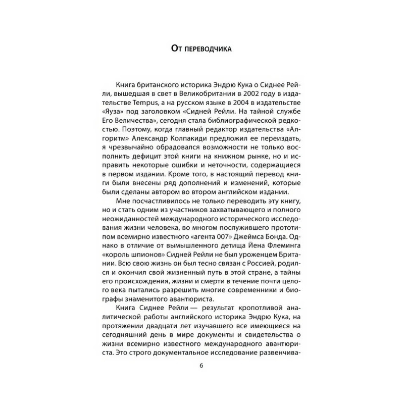 Английского разведчика Сиднея Рейли, который в первой четверти XX века действовал в России, на Дальнем и Ближнем Востоке, одни называют "королем шпионов", а другие великим авантюристом. Кем же на самом деле был один из прототипов Джеймса Бонда? Почему он скрывал подробности своей биографии? Планировал ли он ликвидацию Ленина и Троцкого в 1918 году? Погиб ли он в перестрелке с советскими пограничниками или был тайно расстрелян по личному приказу Сталина? И какие реальные подвиги совершил на фронтах тайной войны?Авторитетный британский историк Эндрю Кук на основе секретного досье английской разведки, малодоступных документов из архивов 15 стран мира (в т. ч. России и Украины), воспоминаниях современников и результатах двадцатилетнего исследования отечает на эти и другие вопросы.