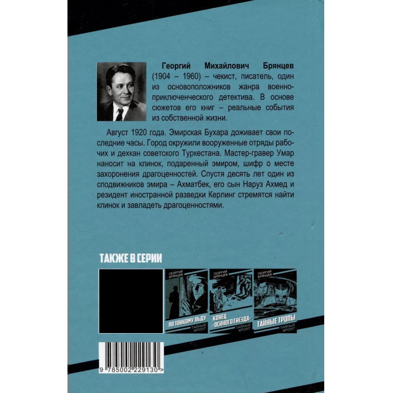 Август 1920 года. Эмирская Бухара доживает свои последние часы. Город окружили вооруженные отряды рабочих и дехкан советского Туркестана. Мастер-гравер Умар наносит на клинок, подаренный эмиром, шифр о месте захоронения драгоценностей. Спустя десять лет один из сподвижников эмира — Ахматбек, его сын Наруз Ахмед и резидент иностранной разведки Керлинг стремятся найти клинок и завладеть драгоценностями. Георгий Михайлович Брянцев (1904 – 1960) — чекист, разведчик, диверсант, почётный сотрудник госбезопасности и талантливейший писатель, всю жизнь посвятивший органам госбезопасности. В основе сюжетов его книг — реальные события из собственной жизни.