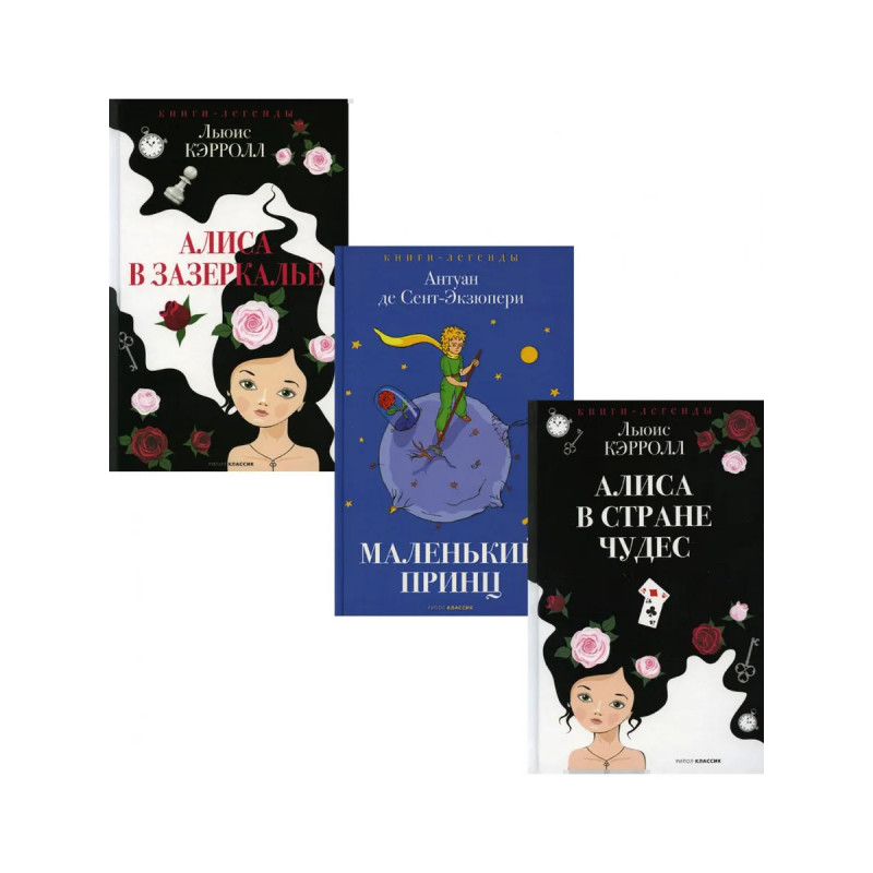 В комплект "Легенды детской классики" вошли книги: "Алиса в Стране чудес" Льюис Кэрролл Знаменитый на весь мир шедевр Льюиса Кэрролла "Алиса в Стране чудес" приглашает вас в невероятную волшебную страну! Поймайте Белого Кролика, побеседуйте с Чеширским Котом, поучаствуйте в чаепитии Безумного Шляпника и сыграйте в крокет с Червонной Королевой. Незабываемые приключения ждут вас! "Маленький принц" / Антуан де Сент-Экзюпери "Маленький принц" - это известное во всем мире произведение Антуана де Сент-Экзюпери. По-детски невинная и по-взрослому мудрая сказка-притча рассказывает о самом главном: любви и дружбе, долге и верности, зле и добре. Эта завораживающая история объединяет поколения и поможет каждому оживить в своем сердце любовь. "Алиса в Зазеркалье" Льюис Кэрролл Присоединяйтесь к сказочным приключениям девочки Алисы в Зазеркалье! На пути от простой Белой Пешки до самой Королевы ей повстречаются сварливые братья Труляля и Траляля, неуклюжий Белый Рыцарь, хитрый Шалтай-Болтай и другие веселые и странные