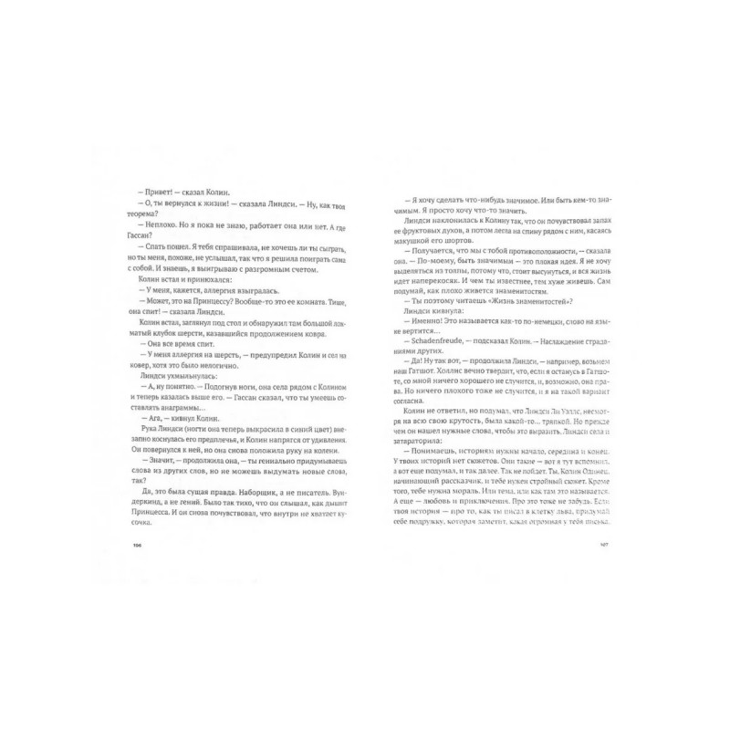 Настоящее очарование этой книги - в характерах главных героев - жизнеутверждающих, умных, не вписывающихся в общественные рамки - и в диалогах. В книгах Джона Грина диалог - это оружие, которое сразит читателя наповал.
