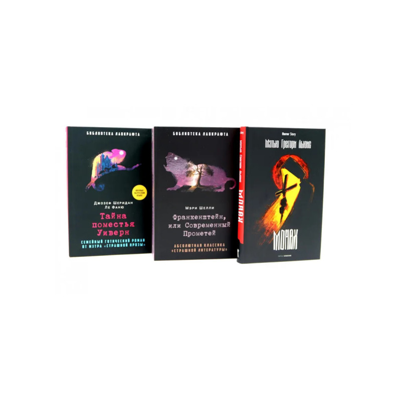 Комплект содержит книги. "Монах" Мэтью Грегори Льюис написал первую версию романа в 1796 году, когда ему было всего 19 лет. "Монах" получился столь грандиозным, что продолжателей было много - от Пушкина с его Рыцарем Бедным, для которого образ Мадонны стал спасением, а не соблазном, до французских сюрреалистов, видевших в Льюисе и де Саде (с восторгом прочитавшем роман "Монах") своих предшественников. Это роман о вере и черном падении. "Франкенштейн, или Современный Прометей" Вданный том входят избранные произведения Мэри Шелли, классика британской мистической литературы- легендарный роман "Франкенштейн, или Современный Прометей" совсеми авторскими предисловиями, атакже основные "страшные" рассказы великой писательницы. "Тайное поместье Уиверн" Впервые нарусском языке- классический роман известного ирландского мастера готической прозы Джозефа Шеридана ЛеФаню "Тайна поместья Уиверн". Это история упадка ивозрождения мелкодворянской семьи, которой необходимо преодолеть взаимное непонимание ивынуж