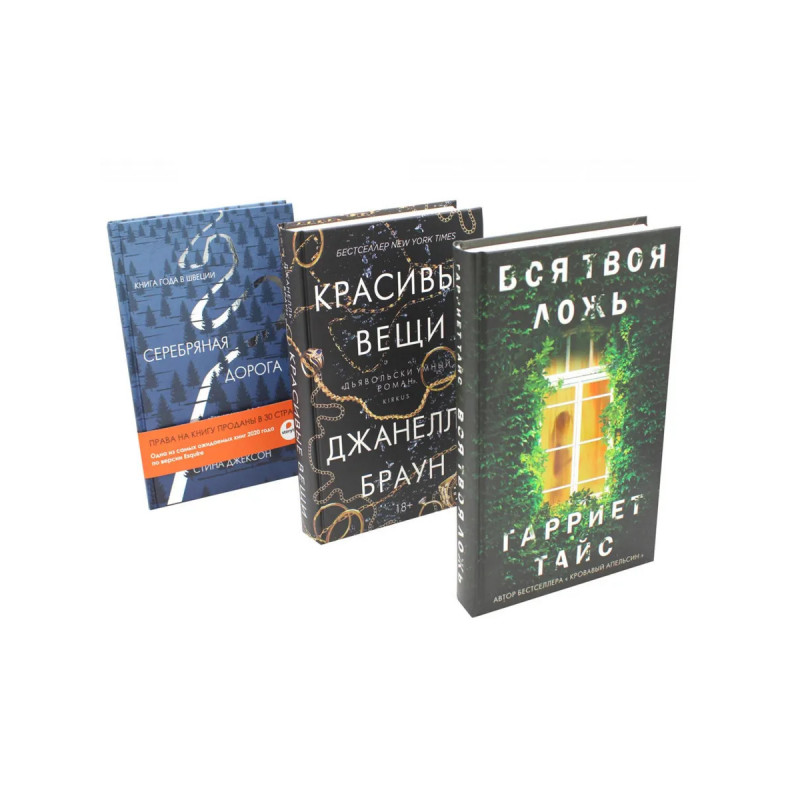 В комлект "Хиты мировго триллера. Выпуск 1" вошли три бестселлера: "Вся твоя ложь" Гарриет Тайс - интригующий роман с атмосферой давящей неопределенности, которую умело поддерживает автор; "Красивые вещи" Джанелль Браун - ошеломляющая история с безупречным саспенсом, виртуозным повествованием и непредсказуемым сюжетом, идеально отражающим блестящий мир Instagram; и "Серебряная дорога" Стины Джексон - история, в которой нет героев, а только обыкновенные люди, которые пытаются пережить свои трагедии.