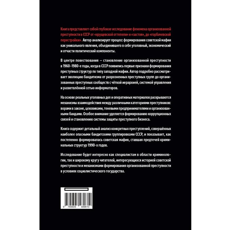 Книга представляет собой глубокое исследование феномена организованной преступности вСССР от «хрущевской оттепели» и«застоя», до «горбачевской перестройки». Автор анализирует процесс формирования советской мафии как уникального явления, объединившего всебе уголовный, экономический иотчасти политический компоненты.