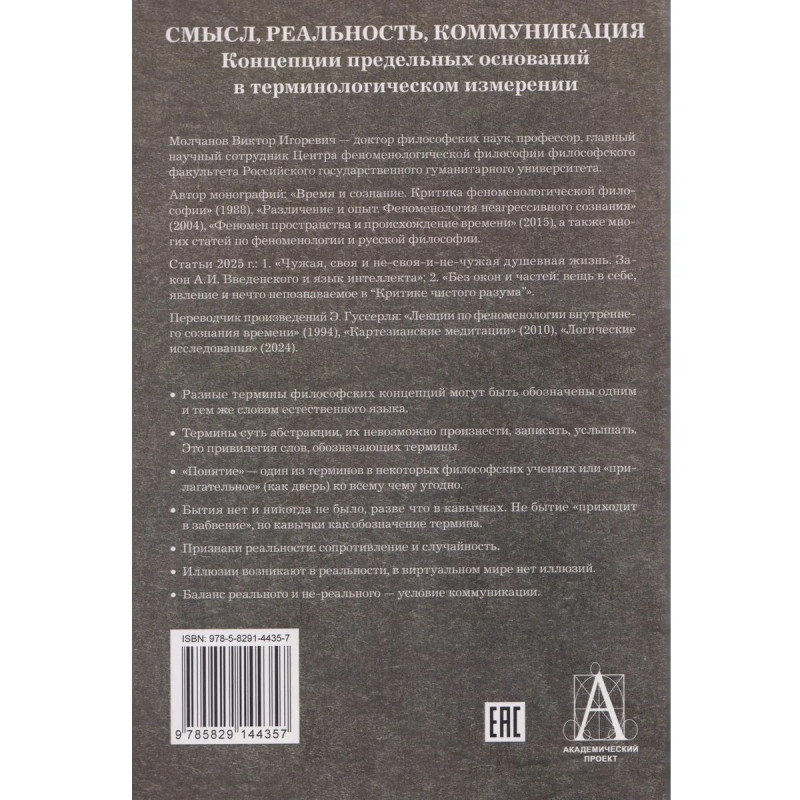 «Смысл», «реальность», «коммуникация» как необходимые условия и предельные основания жизни-людей-в-мирес рассматриваются с концептуальной и терминологической точки зрения. Терминологический и критический анализ концепций И. Канта, Э. Гуссерля. Г. Шпета, В. Гумбольдта. А. Щюца (также всвязи с методологией М. Вебера), М. Хайдеггера, Ж.-П. Сартра, М. Мамардашвили, Д. Чалмерса, А. Бергсона, Ж. Делёза (в порядке рассмотрения) основан на предпосылке различия терминов и слов естественного языка. Исходный тезис анализа: разные термины могут быть выражены одним и тем же словом. Особое внимание уделяется слову и термину «смысл» как посреднику между естественным языком и философской терминологией.Суждение и коммуникация, а также коррелятивность реального и не-реального - основные темы второй части книги. Проводится различие между абстракциями и псевдо-абстракциями в ряде философских концепций, а также подвергаются критике концепции, в которых «форма» и «понятие» играют ведущую роль. Ставится вопрос об основных критериях