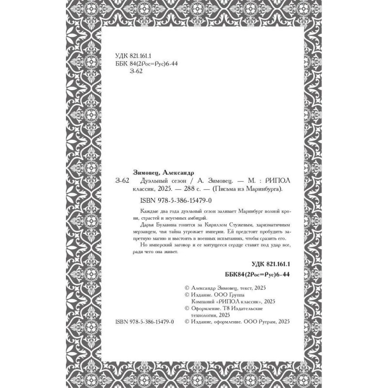 Каждые два года дуэльный сезон заливает Маринбург волной крови, страстей и неуёмных амбиций. Дарья Булавина гонится за Кириллом Стужевым, харизматичным мерзавцем, чья тайна угрожает империи. Ей предстоит пробудить запретную магию и выстоять в военных испытаниях, чтобы сразить его. Но имперский заговор и ее мятущееся сердце ставят под удар все, ради чего она живет.Книга «Дуэльный сезон» – совместный проект издательской платформы «Rugram», издательства «Рипол-классик» и литературной платформы «Литнет».