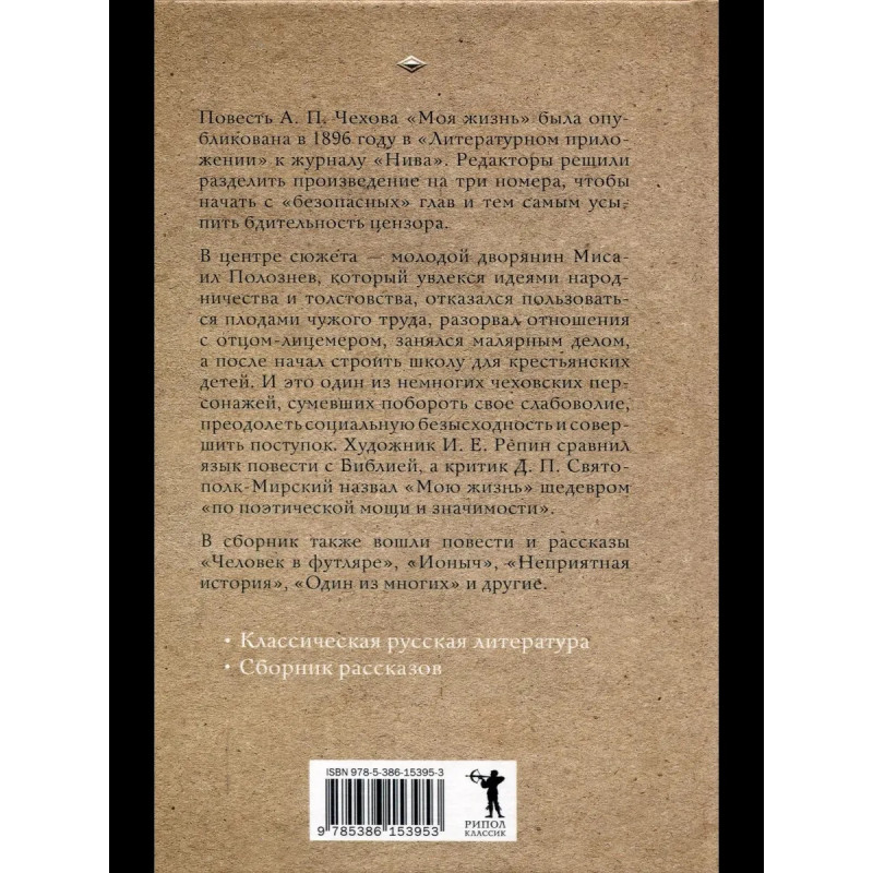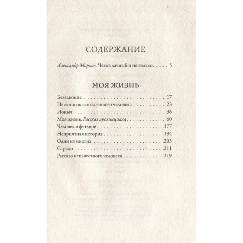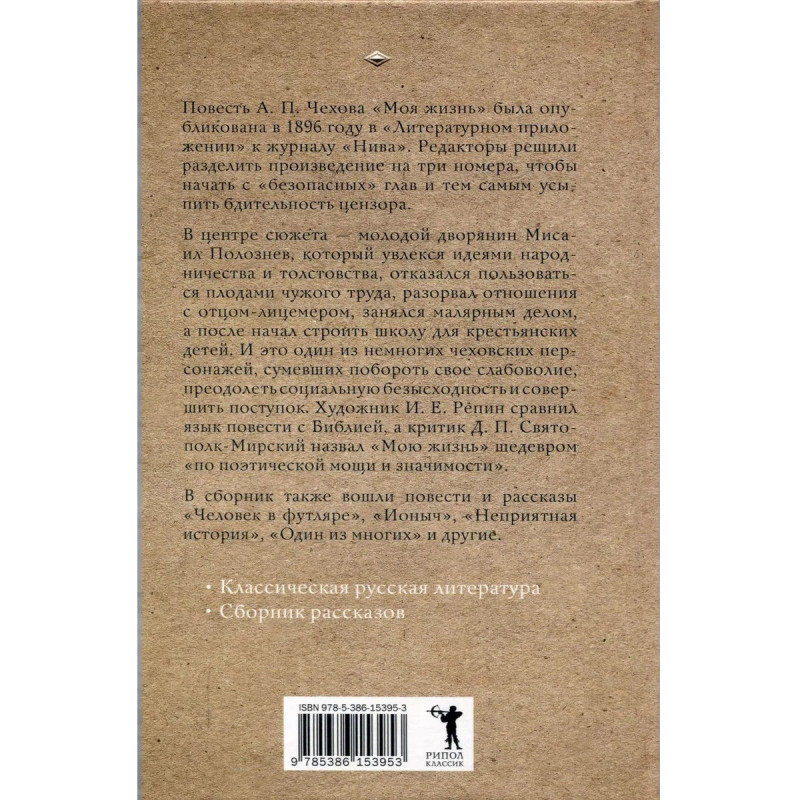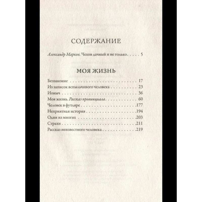 Повесть А. П. Чехова "Моя жизнь" увидела свет в 1896 году. Антон Павлович рассказывает о дворянине, который увлекся философией Л. Н. Толстого - толстовством. Из-за этого герой Михаил Полознев бросает дом и становится маляром, живет простой жизнью и много работает. Художник Илья Репин очень высоко ценил это произведение: "Какая простота, сила, неожиданность; этот серый обыденный тон, это прозаическое миросозерцание являются в таком новом увлекательном освещении. А какой язык! - Библия". Сам же Лев Николаевич Толстой сдержано принял повесть, хотя и высоко оценил проработку некоторых персонажей. В сборник вошли и другие культовые повести и рассказы: "Человек в футляре", "Ионыч", "Рассказ неизвестного человека" и прочие.