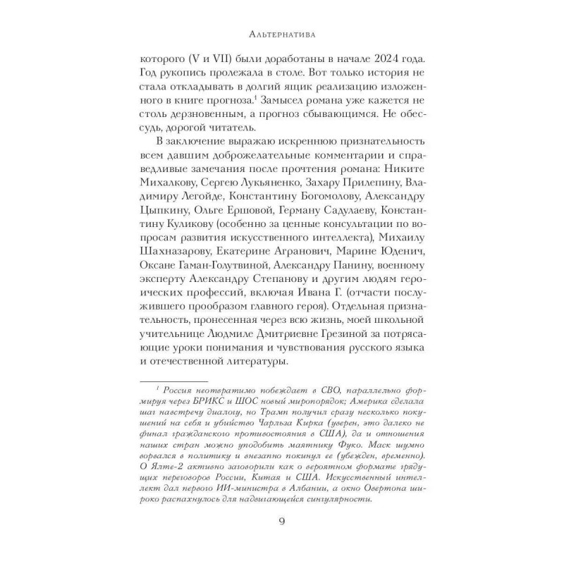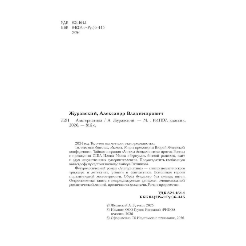 2034 год. То, о чем мы мечтали, стало реальностью. То, чего они боялись, сбылось. Мир в преддверии второй Ялтинской конференции. Тайная операция "Ангелы Апокалипсиса" против России и президента США Илона Маска обернулась битвой разведок, элит и двух искусственных суперинтеллектов. Предотвратить глобальную катастрофу предстоит команде майора Ратникова. Футурологический роман "Альтернатива" - синтез политического триллера и детектива, утопии и фантастики. Вселенная героев поразительной достоверности. Образ будущего без слепых пятен. Остросюжетная книга с непредсказуемым финалом, эмоциональной романтической линией, ироничными диалогами. Роман-пророчество.
