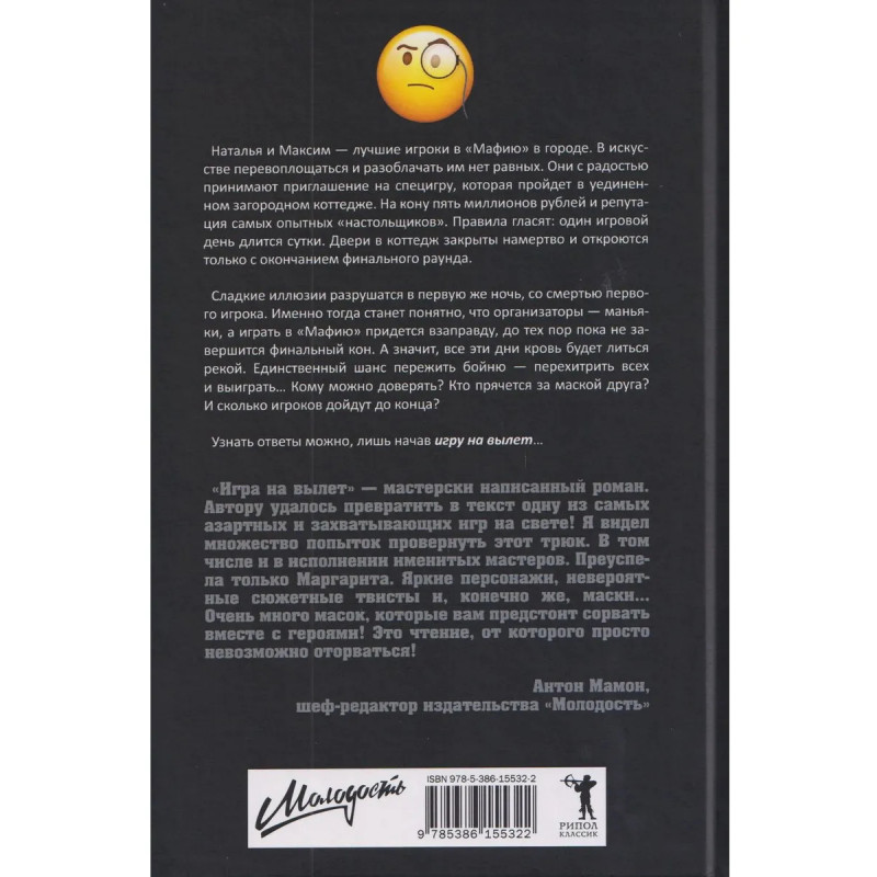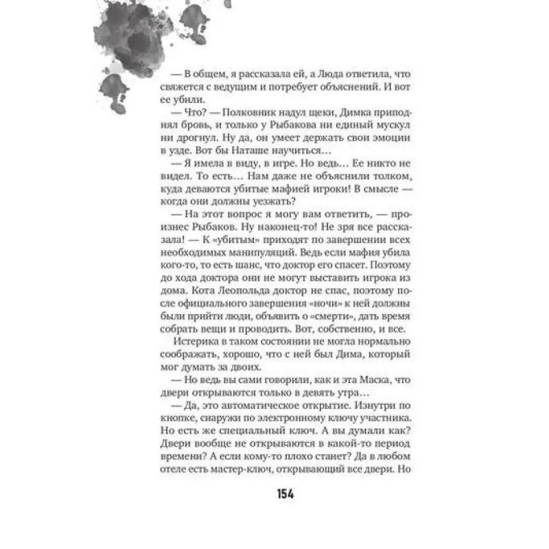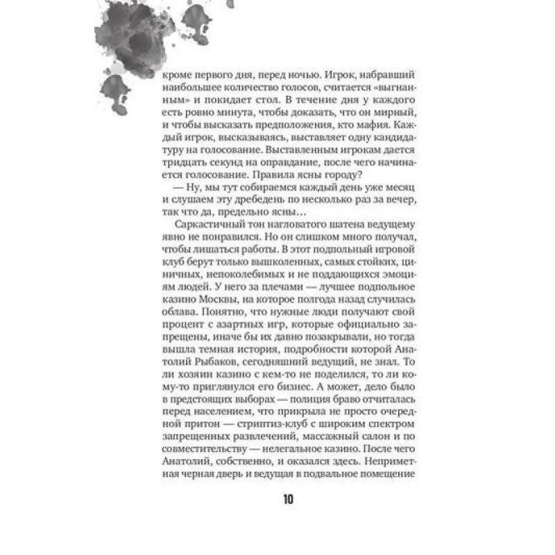 Наталья и Максим — лучшие игроки в «Мафию» в городе. В искусстве перевоплощаться и разоблачать им нет равных. Они с радостью принимают приглашение на специгру, которая пройдет в уединенном загородном коттедже. На кону пять миллионов рублей и репутация самых опытных «настольщиков». Правила гласят: один игровой день длится сутки. Двери в коттедж закрыты намертво и откроются только с окончанием финального раунда.Сладкие иллюзии разрушатся в первую же ночь, со смертью первого игрока. Именно тогда станет понятно, что организаторы — маньяки, а играть в «Мафию» придется взаправду, до тех пор пока не завершится финальный кон. А значит, все эти дни кровь будет литься рекой. Единственный шанс пережить бойню — перехитрить всех и выиграть. Кому можно доверять? Кто прячется за маской друга? И сколько игроков дойдут до конца?Узнать ответы можно, лишь начав игру на вылет.