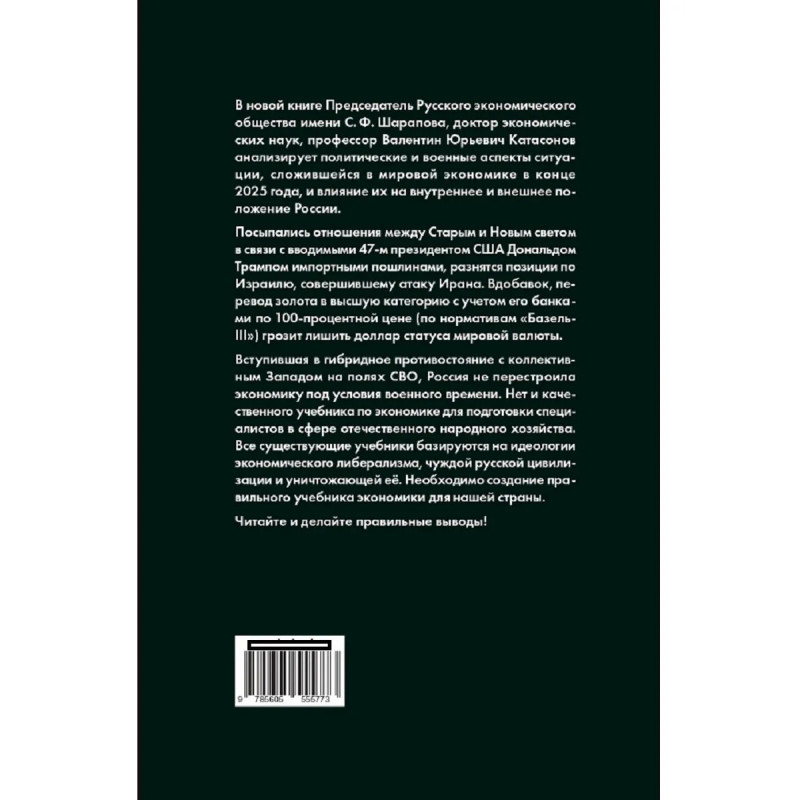 В новой книге Председатель Русского экономического общества имени С.Ф. Шарапова, доктор экономических наук, профессор Валентин Юрьевич Катасонов анализирует политические и военные аспекты ситуации, сложившейся в мировой экономике в конце 2025 года, и влияние их на внутреннее и внешнее положение России.